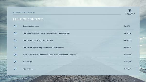 © All rights reserved. Two Seas Capital LP TABLE OF CONTENTS INVESTOR PRESENTATION PAGE 3 Executive Summary 01 PAGE 14 The Board’s Deal Process and Negotiations Were Egregious 02 PAGE 25 The Transaction Structure Is Deficient 03 PAGE 35 The Merger Significantly Undervalues Core Scientific 04 PAGE 50 Core Scientific Has Tremendous Value as an Independent Company 05 PAGE 65 Conclusion 06 PAGE 71 Appendices 07
