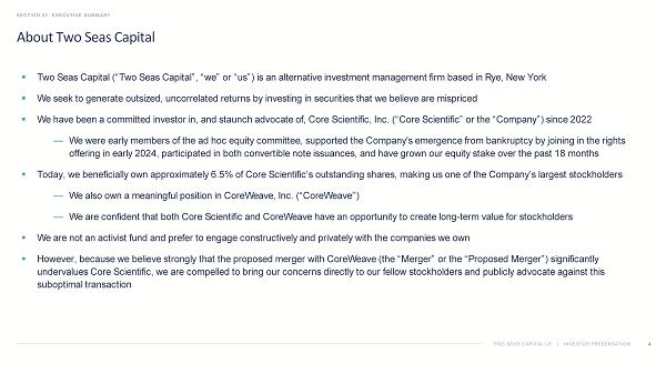 TWO SEAS CAPITAL LP | INVESTOR PRESENTATION About Two Seas Capital SECTION 01: EXECUTIVE SUMMARY 4 ▪ Two Seas Capital (“Two Seas Capital”, “we” or “us”) is an alternative investment management firm based in Rye, New York ▪ We seek to generate outsized, uncorrelated returns by investing in securities that we believe are mispriced ▪ We have been a committed investor in, and staunch advocate of, Core Scientific, Inc. (“Core Scientific” or the “Company”) sin ce 2022 — We were early members of the ad hoc equity committee, supported the Company's emergence from bankruptcy by joining in the rig hts offering in early 2024, participated in both convertible note issuances, and have grown our equity stake over the past 18 mon ths ▪ Today, we beneficially own approximately 6.5% of Core Scientific’s outstanding shares, making us one of the Company’s largest st ockholders — We also own a meaningful position in CoreWeave, Inc. (“CoreWeave”) — We are confident that both Core Scientific and CoreWeave have an opportunity to create long - term value for stockholders ▪ We are not an activist fund and prefer to engage constructively and privately with the companies we own ▪ However, because we believe strongly that the proposed merger with CoreWeave (the “Merger” or the “Proposed Merger”) signific ant ly undervalues Core Scientific, we are compelled to bring our concerns directly to our fellow stockholders and publicly advocate ag ainst this suboptimal transaction