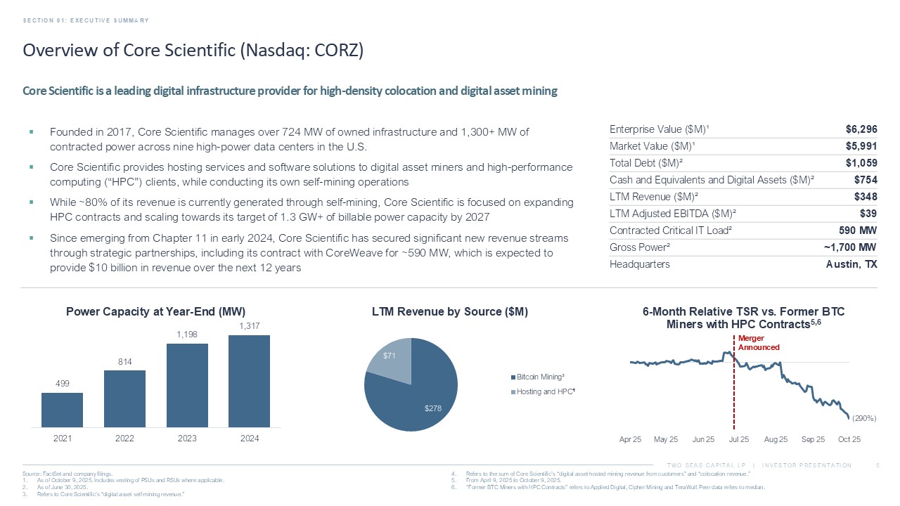TWO SEAS CAPITAL LP | INVESTOR PRESENTATION Overview of Core Scientific (Nasdaq: CORZ) SECTION 01: EXECUTIVE SUMMARY 5 Source: FactSet and company filings. 1. As of October 9, 2025. 2. As of June 30, 2025. 3. Refers to Core Scientific’s “digital asset self - mining revenue.” 4. Refers to the sum of Core Scientific’s “digital asset hosted mining revenue from customers” and “colocation revenue.” 5. From April 9, 2025 to October 9, 2025. 6. “Former BTC Miners with HPC Contracts” refers to Applied Digital, Cipher Mining and TeraWulf . Peer data refers to median. ▪ Founded in 2017, Core Scientific manages over 724 MW of owned infrastructure and 1,300+ MW of contracted power across nine high - power data centers in the U.S. ▪ Core Scientific provides hosting services and software solutions to digital asset miners and high - performance computing (“HPC”) clients, while conducting its own self - mining operations ▪ While ~80% of its revenue is currently generated through self - mining, Core Scientific is focused on expanding HPC contracts and scaling towards its target of 1.3 GW+ of billable power capacity by 2027 ▪ Since emerging from Chapter 11 in early 2024, Core Scientific has secured significant new revenue streams through strategic partnerships, including its contract with CoreWeave for ~590 MW, which is expected to provide $10 billion in revenue over the next 12 years Core Scientific is a leading digital infrastructure provider for high - density colocation and digital asset mining $6,296 Enterprise Value ($M)¹ $5,991 Market Value ($M)¹ $1,059 Total Debt ($M)² $754 Cash and Equivalents and Digital Assets ($M)² $348 LTM Revenue ($M)² $39 LTM Adjusted EBITDA ($M)² 875 MW Billable Power Load² 1,335 MW Gross Power² Austin, TX Headquarters $278 $71 LTM Revenue by Source ($M) Bitcoin Mining³ Hosting and HPC ⁴ 499 814 1,198 1,317 2021 2022 2023 2024 Power Capacity at Year - End (MW) (290%) Apr 25 May 25 Jun 25 Jul 25 Aug 25 Sep 25 Oct 25 6 - Month Relative TSR vs. Former BTC Miners with HPC Contracts 5,6 Merger Announced