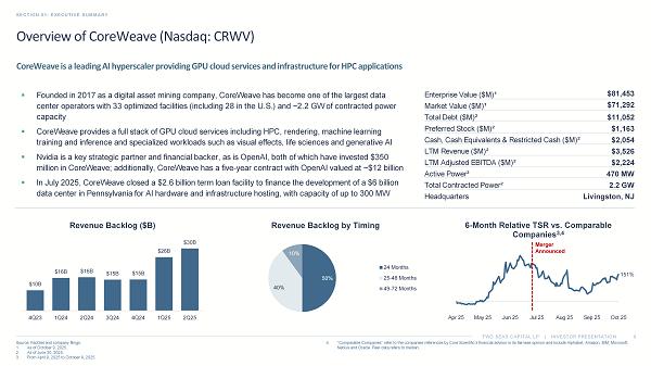TWO SEAS CAPITAL LP | INVESTOR PRESENTATION Overview of CoreWeave (Nasdaq: CRWV) SECTION 01: EXECUTIVE SUMMARY 6 Source: FactSet and company filings. 1. As of October 9, 2025. 2. As of June 30, 2025. 3. From April 9, 2025 to October 9, 2025. 4. “Comparable Companies” refer to the companies references by Core Scientific’s financial advisor in its fairness opinion and i ncl ude Alphabet, Amazon, IBM, Microsoft, Nebius and Oracle. Peer data refers to median. CoreWeave is a leading AI hyperscaler providing GPU cloud services and infrastructure for HPC applications ▪ Founded in 2017 as a digital asset mining company, CoreWeave has become one of the largest data center operators with 33 optimized facilities (including 28 in the U.S.) and ~2.2 GW of contracted power capacity ▪ CoreWeave provides a full stack of GPU cloud services including HPC, rendering, machine learning training and inference and specialized workloads such as visual effects, life sciences and generative AI ▪ Nvidia is a key strategic partner and financial backer, as is OpenAI, both of which have invested $350 million in CoreWeave; additionally, CoreWeave has a five - year contract with OpenAI valued at ~$12 billion ▪ In July 2025, CoreWeave closed a $2.6 billion term loan facility to finance the development of a $6 billion data center in Pennsylvania for AI hardware and infrastructure hosting, with capacity of up to 300 MW $81,453 Enterprise Value ($M)¹ $71,292 Market Value ($M)¹ $11,052 Total Debt ($M)² $1,163 Preferred Stock ($M)² $2,054 Cash, Cash Equivalents & Restricted Cash ($M)² $3,526 LTM Revenue ($M)² $2,224 LTM Adjusted EBITDA ($M)² 470 MW Active Power² 2.2 GW Total Contracted Power² Livingston, NJ Headquarters $10B $16B $16B $15B $15B $26B $30B 4Q23 1Q24 2Q24 3Q24 4Q24 1Q25 2Q25 Revenue Backlog ($B) 50% 40% 10% Revenue Backlog by Timing 24 Months 25-48 Months 49-72 Months 151% Apr 25 May 25 Jun 25 Jul 25 Aug 25 Sep 25 Oct 25 6 - Month Relative TSR vs. Comparable Companies 3,4 Merger Announced