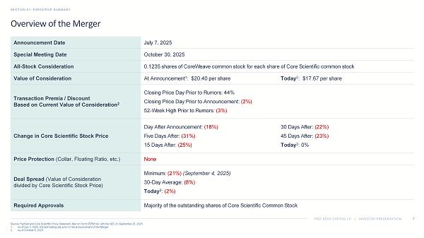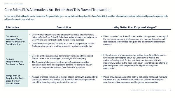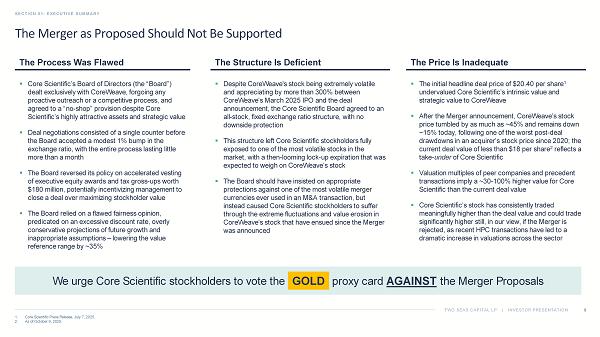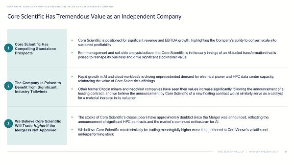 TWO SEAS CAPITAL LP | INVESTOR PRESENTATION The Merger as Proposed Should Not Be Supported SECTION 06: CONCLUSION 70 1. Core Scientific Press Release, July 7, 2025. 2. As of October 9, 2025. We urge Core Scientific stockholders to vote the GOLD proxy card AGAINST the Merger Proposals The Price Is Inadequate The Structure Is Deficient The Process Was Flawed ▪ The initial headline deal price of $20.40 per share 1 undervalued Core Scientific’s intrinsic value and strategic value to CoreWeave ▪ After the Merger announcement, CoreWeave’s stock price tumbled by as much as ~45% and remains down ~15% today, following one of the worst post - deal drawdowns in an acquirer’s stock price since 2020; the current deal value of less than $18 per share 2 reflects a take - under of Core Scientific ▪ Valuation multiples of peer companies and precedent transactions imply a ~30 - 100% higher value for Core Scientific than the current deal value ▪ Core Scientific’s stock has consistently traded meaningfully higher than the deal value and could trade significantly higher still, in our view, if the Merger is rejected, as recent HPC transactions have led to a dramatic increase in valuations across the sector ▪ Despite CoreWeave's stock being extremely volatile and appreciating by more than 300% between CoreWeave’s March 2025 IPO and the deal announcement, the Core Scientific Board agreed to an all - stock, fixed exchange ratio structure, with no downside protection ▪ This structure left Core Scientific stockholders fully exposed to one of the most volatile stocks in the market, with a then - looming lock - up expiration that was expected to weigh on CoreWeave’s stock ▪ The Board should have insisted on appropriate protections against one of the most volatile merger currencies ever used in an M&A transaction, but instead caused Core Scientific stockholders to suffer through the extreme fluctuations and value erosion in CoreWeave’s stock that have ensued since the Merger was announced ▪ Core Scientific’s Board of Directors (the “Board”) dealt exclusively with CoreWeave, forgoing any proactive outreach or a competitive process, and agreed to a “no - shop” provision despite Core Scientific’s highly attractive assets and strategic value ▪ Deal negotiations consisted of a single counter before the Board accepted a modest 1% bump in the exchange ratio, with the entire process lasting little more than a month ▪ The Board reversed its policy on accelerated vesting of executive equity awards and tax gross - ups worth $180 million, potentially incentivizing management to close a deal over maximizing stockholder value ▪ The Board relied on a flawed fairness opinion, predicated on an excessive discount rate, overly conservative projections of future growth and inappropriate assumptions – lowering the value reference range by ~35% GOLD