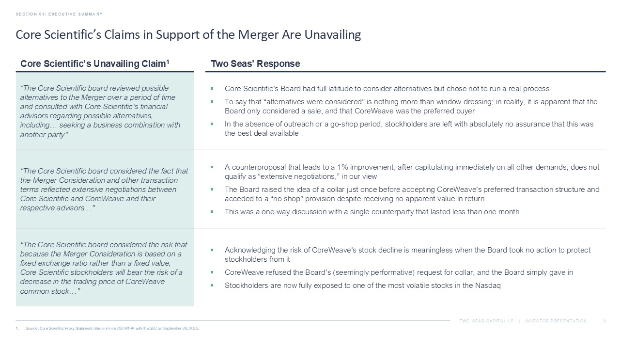 TWO SEAS CAPITAL LP | INVESTOR PRESENTATION The Merger as Proposed Should Not Be Supported SECTION 01: EXECUTIVE SUMMARY 8 1. Core Scientific Press Release, July 7, 2025. 2. As of October 9, 2025. We urge Core Scientific stockholders to vote the GOLD proxy card AGAINST the Merger Proposals The Price Is Inadequate The Structure Is Deficient The Process Was Flawed ▪ The initial headline deal price of $20.40 per share 1 undervalued Core Scientific’s intrinsic value and strategic value to CoreWeave ▪ After the Merger announcement, CoreWeave’s stock price tumbled by as much as ~45% and remains down ~15% today, following one of the worst post - deal drawdowns in an acquirer’s stock price since 2020; the current deal value of less than $18 per share 2 reflects a take - under of Core Scientific ▪ Valuation multiples of peer companies and precedent transactions imply a ~30 - 100% higher value for Core Scientific than the current deal value ▪ Core Scientific’s stock has consistently traded meaningfully higher than the deal value and could trade significantly higher still, in our view, if the Merger is rejected, as recent HPC transactions have led to a dramatic increase in valuations across the sector ▪ Despite CoreWeave's stock being extremely volatile and appreciating by more than 300% between CoreWeave’s March 2025 IPO and the deal announcement, the Core Scientific Board agreed to an all - stock, fixed exchange ratio structure, with no downside protection ▪ This structure left Core Scientific stockholders fully exposed to one of the most volatile stocks in the market, with a then - looming lock - up expiration that was expected to weigh on CoreWeave’s stock ▪ The Board should have insisted on appropriate protections against one of the most volatile merger currencies ever used in an M&A transaction, but instead caused Core Scientific stockholders to suffer through the extreme fluctuations and value erosion in CoreWeave’s stock that have ensued since the Merger was announced ▪ Core Scientific’s Board of Directors (the “Board”) dealt exclusively with CoreWeave, forgoing any proactive outreach or a competitive process, and agreed to a “no - shop” provision despite Core Scientific’s highly attractive assets and strategic value ▪ Deal negotiations consisted of a single counter before the Board accepted a modest 1% bump in the exchange ratio, with the entire process lasting little more than a month ▪ The Board reversed its policy on accelerated vesting of executive equity awards and tax gross - ups worth $180 million, potentially incentivizing management to close a deal over maximizing stockholder value ▪ The Board relied on a flawed fairness opinion, predicated on an excessive discount rate, overly conservative projections of future growth and inappropriate assumptions – lowering the value reference range by ~35% GOLD