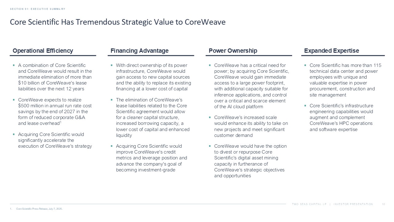 TWO SEAS CAPITAL LP | INVESTOR PRESENTATION Core Scientific Has Tremendous Strategic Value to CoreWeave SECTION 01: EXECUTIVE SUMMARY 9 1. Core Scientific Press Release, July 7, 2025. Expanded Expertise Power Ownership Financing Advantage Operational Efficiency ▪ Core Scientific has more than 115 technical data center and power employees with unique and valuable expertise in power procurement, construction and site management ▪ Core Scientific’s infrastructure engineering capabilities would augment and complement CoreWeave’s HPC operations and software expertise ▪ CoreWeave has a critical need for power; by acquiring Core Scientific, CoreWeave would gain immediate access to a large power footprint, with additional capacity suitable for inference applications, and control over a critical and scarce element of the AI cloud platform ▪ CoreWeave’s increased scale would enhance its ability to take on new projects and meet significant customer demand ▪ CoreWeave would have the option to divest or repurpose Core Scientific’s digital asset mining capacity in furtherance of CoreWeave’s strategic objectives and opportunities ▪ With direct ownership of its power infrastructure, CoreWeave would gain access to new capital sources and the ability to replace its existing financing at a lower cost of capital ▪ The elimination of CoreWeave’s lease liabilities related to the Core Scientific agreement would allow for a cleaner capital structure, increased borrowing capacity, a lower cost of capital and enhanced liquidity ▪ Acquiring Core Scientific would improve CoreWeave’s credit metrics and leverage position and advance the company’s goal of becoming investment - grade ▪ A combination of Core Scientific and CoreWeave would result in the immediate elimination of more than $10 billion of CoreWeave’s lease liabilities over the next 12 years ▪ CoreWeave expects to realize $500 million in annual run rate cost savings by the end of 2027 in the form of reduced corporate G&A and lease overhead 1 ▪ Acquiring Core Scientific would significantly accelerate the execution of CoreWeave’s strategy