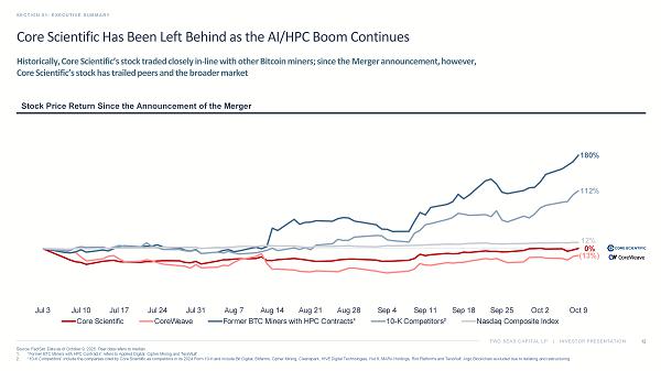 TWO SEAS CAPITAL LP | INVESTOR PRESENTATION Core Scientific Has Been Left Behind as the AI/ HPC Boom Continues SECTION 01: EXECUTIVE SUMMARY 12 Source: FactSet. Data as of October 9, 2025. Peer data refers to median. 1. “Former BTC Miners with HPC Contracts” refers to Applied Digital, Cipher Mining and TeraWulf . 2. “10 - K Competitors” include the companies cited by Core Scientific as competitors in its 2024 Form 10 - K and include Bit Digital, Bitfarms, Cipher Mining, Cleanspark , HIVE Digital Technologies, Hut 8, MARA Holdings, Riot Platforms and TeraWulf . Argo Blockchain excluded due to delisting and restructuring. Historically, Core Scientific’s stock traded closely in - line with other Bitcoin miners; since the Merger announcement, however, Core Scientific’s stock has trailed peers and the broader market Stock Price Return Since the Announcement of the Merger 0% (13%) 180% 112% 12% Jul 3 Jul 10 Jul 17 Jul 24 Jul 31 Aug 7 Aug 14 Aug 21 Aug 28 Sep 4 Sep 11 Sep 18 Sep 25 Oct 2 Oct 9 Core Scientific CoreWeave Former BTC Miners with HPC Contracts¹ 10-K Competitors² Nasdaq Composite Index