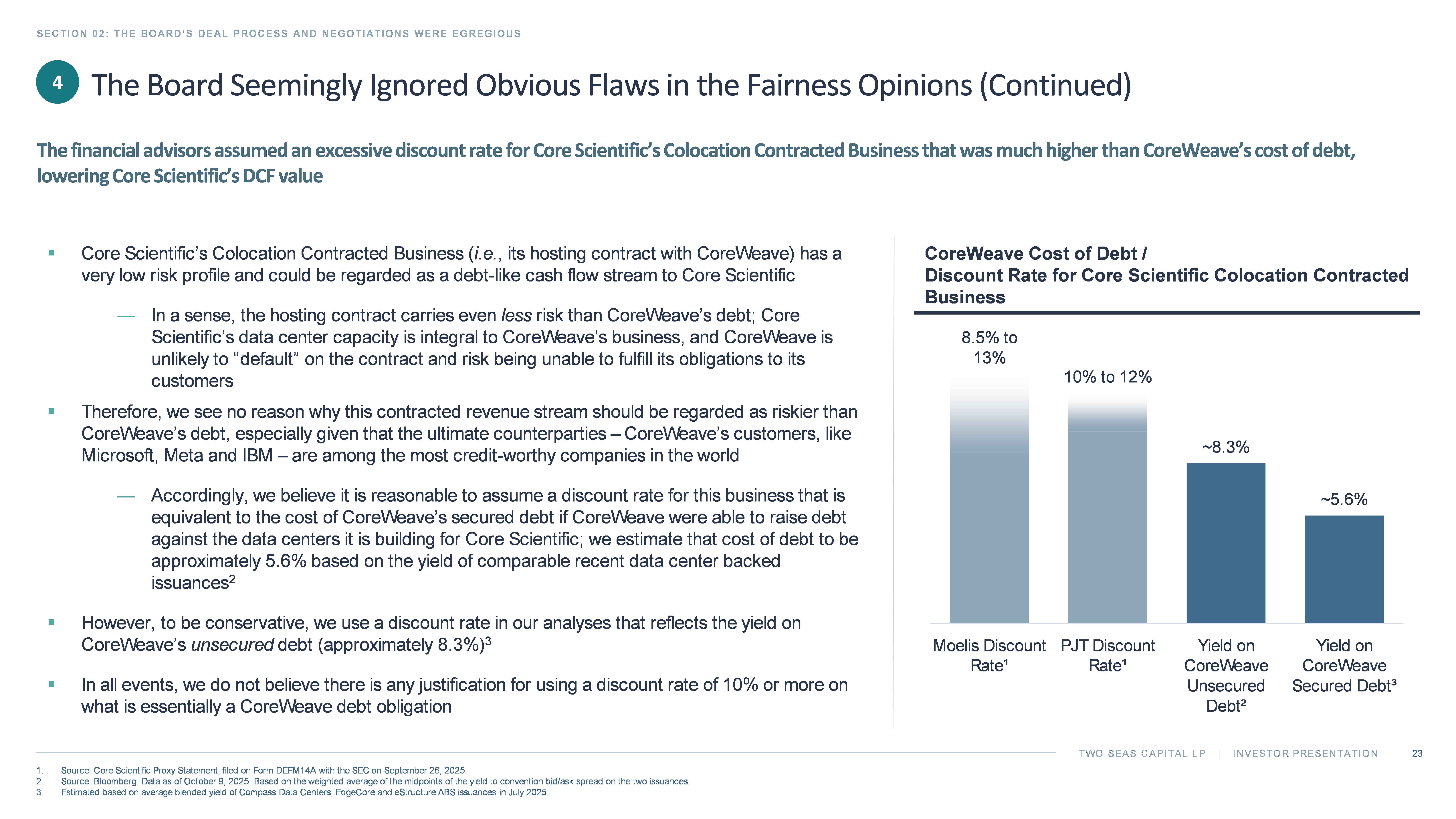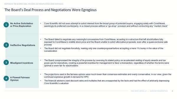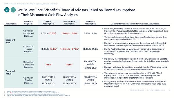 TWO SEAS CAPITAL LP | INVESTOR PRESENTATION SECTION 02: THE BOARD’S DEAL PROCESS AND NEGOTIATIONS WERE EGREGIOUS 23 1. Source: Core Scientific Proxy Statement, filed on Form DEFM14A with the SEC on September 26, 2025. 2. Source: Bloomberg. Data as of October 9, 2025. Based on the weighted average of the midpoints of the yield to convention bid/ ask spread on the two issuances. 3. Estimated based on average blended yield of Compass Data Centers, EdgeCore and eStructure ABS issuances in July 2025. CoreWeave Cost of Debt / Discount Rate for Core Scientific Colocation Contracted Business 4 ▪ Core Scientific’s Colocation Contracted Business ( i.e. , its hosting contract with CoreWeave) has a very low risk profile and could be regarded as a debt - like cash flow stream to Core Scientific — In a sense, the hosting contract carries even less risk than CoreWeave’s debt; Core Scientific’s data center capacity is integral to CoreWeave’s business, and CoreWeave is unlikely to “default” on the contract and risk being unable to fulfill its obligations to its customers ▪ Therefore, we see no reason why this contracted revenue stream should be regarded as riskier than CoreWeave’s debt, especially given that the ultimate counterparties – CoreWeave’s customers, like Microsoft, Meta and IBM – are among the most credit - worthy companies in the world — Accordingly, we believe it is reasonable to assume a discount rate for this business that is equivalent to the cost of CoreWeave’s secured debt if CoreWeave were able to raise debt against the data centers it is building for Core Scientific; we estimate that cost of debt to be approximately 5.6% based on the yield of comparable recent data center backed issuances 2 ▪ However, to be conservative, we use a discount rate in our analyses that reflects the yield on CoreWeave’s unsecured debt (approximately 8.3%) 3 ▪ In all events, we do not believe there is any justification for using a discount rate of 10% or more on what is essentially a CoreWeave debt obligation The Board Seemingly Ignored Obvious Flaws in the Fairness Opinions (Continued) The financial advisors assumed an excessive discount rate for Core Scientific’s Colocation Contracted Business that was much hig her than CoreWeave’s cost of debt, lowering Core Scientific’s DCF value 8.5% to 13% 10% to 12% ~8.3% ~5.6% Moelis Discount Rate¹ PJT Discount Rate¹ Yield on CoreWeave Unsecured Debt² Yield on CoreWeave Secured Debt³