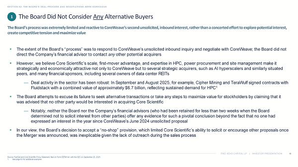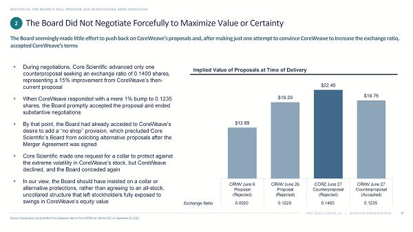 TWO SEAS CAPITAL LP | INVESTOR PRESENTATION The Board Did Not Consider Any Alternative Buyers SECTION 02: THE BOARD’S DEAL PROCESS AND NEGOTIATIONS WERE EGREGIOUS 16 Source: FactSet and Core Scientific Proxy Statement, filed on Form DEFM14A with the SEC on September 26, 2025. 1. See page 63 for additional examples. ▪ The extent of the Board’s “process” was to respond to CoreWeave’s unsolicited inbound inquiry and negotiate with CoreWeave; t he Board did not direct the Company’s financial advisor to contact any other potential acquirers ▪ However, we believe Core Scientific’s scale, first - mover advantage, and expertise in HPC, power procurement and site management make it strategically and economically attractive not only to CoreWeave but to several strategic acquirers, such as AI hyperscalers and similarly situated peers, and many financial sponsors, including several owners of data center REITs — Deal activity in the sector has been robust: In September and August 2025, for example, Cipher Mining and TeraWulf signed contracts with Fluidstack with a combined value of approximately $6.7 billion, reflecting sustained demand for HPC 1 ▪ The Board attempts to excuse its failure to seek alternative transactions or take any steps to maximize value for stockholder s b y claiming that it was advised that no other party would be interested in acquiring Core Scientific — Notably, neither the Board nor the Company’s financial advisors (who had been retained for less than two weeks when the Board determined not to solicit interest from other parties) offer any evidence for such a pivotal conclusion beyond the fact that no one had expressed an interest in the year since CoreWeave’s June 2024 unsolicited proposal ▪ In our view, the Board’s decision to accept a “no - shop” provision, which limited Core Scientific’s ability to solicit or encoura ge other proposals once the Merger was announced, was inexplicable given the lack of outreach during the sales process The Board’s process was extremely limited and reactive to CoreWeave’s second unsolicited, inbound interest, rather than a con cer ted effort to explore potential interest, create competitive tension and maximize value 1