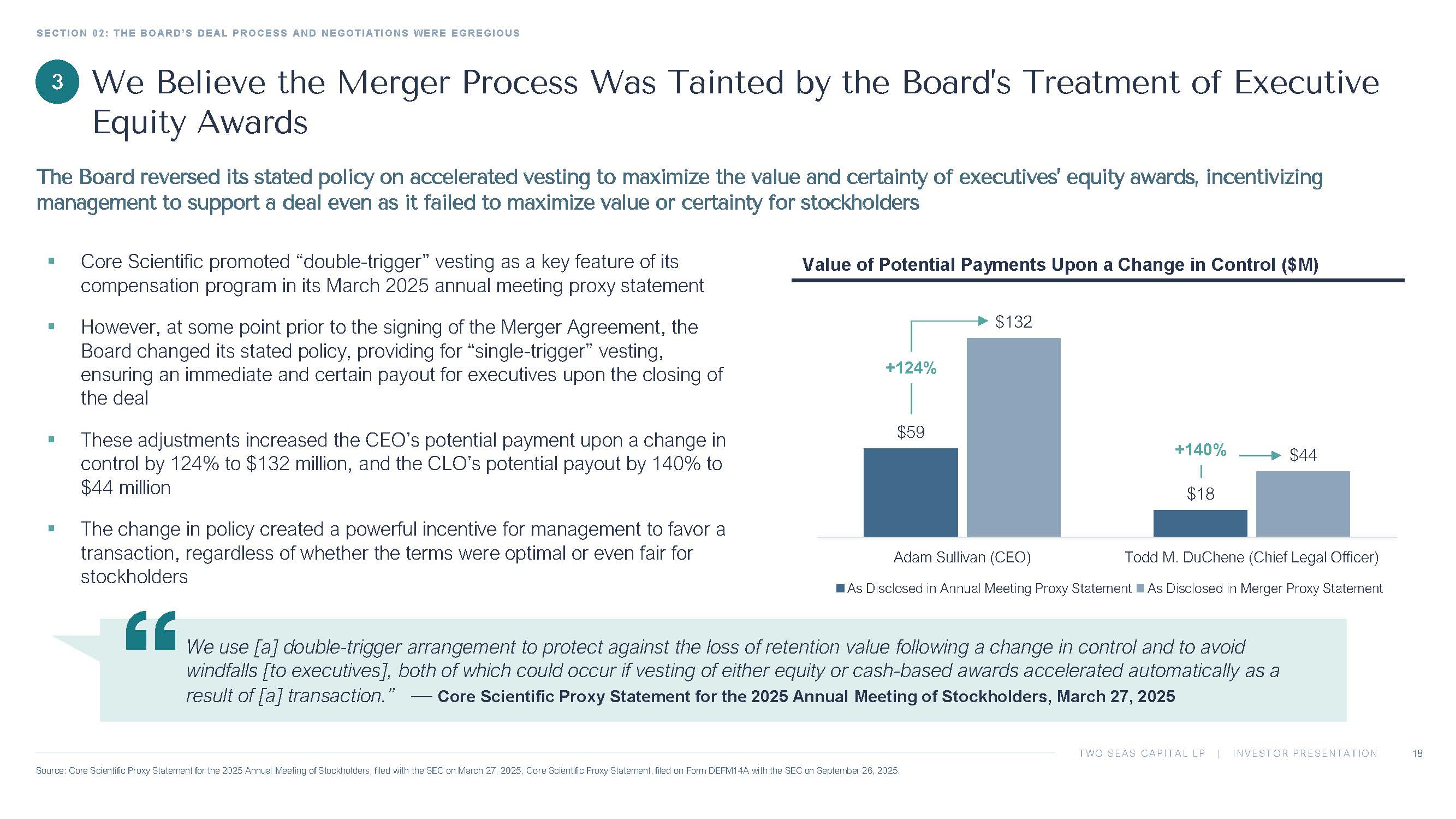 TWO SEAS CAPITAL LP | INVESTOR PRESENTATION SECTION 02: THE BOARD’S DEAL PROCESS AND NEGOTIATIONS WERE EGREGIOUS 18 Source: Core Scientific Proxy Statement for the 2025 Annual Meeting of Stockholders, filed with the SEC on March 27, 2025, Co re Scientific Proxy Statement, filed on Form DEFM14A with the SEC on September 26, 2025. We Believe the Merger Process Was Tainted by the Board’s Treatment of Executive Equity Awards The Board reversed its stated policy on accelerated vesting to maximize the value and certainty of executives’ equity awards, in centivizing management to support a deal even as it failed to maximize value or certainty for stockholders ▪ Core Scientific promoted “double - trigger” vesting as a key feature of its compensation program in its March 2025 annual meeting proxy statement ▪ However, at some point prior to the signing of the Merger Agreement, the Board changed its stated policy, providing for “single - trigger” vesting, ensuring an immediate and certain payout for executives upon the closing of the deal ▪ These adjustments increased the CEO’s potential payment upon a change in control by 124% to $132 million, and the CLO’s potential payout by 140% to $44 million ▪ The change in policy created a powerful incentive for management to favor a transaction, regardless of whether the terms were optimal or even fair for stockholders Value of Potential Payments Upon a Change in Control ($M) $59 $18 $132 $44 Adam Sullivan (CEO) Todd M. DuChene (Chief Legal Officer) As Disclosed in Annual Meeting Proxy Statement As Disclosed in Merger Proxy Statement +124% +140% 3 We use [a] double - trigger arrangement to protect against the loss of retention value following a change in control and to avoid windfalls [to executives], both of which could occur if vesting of either equity or cash - based awards accelerated automatically as a result of [a] transaction.” — Core Scientific Proxy Statement for the 2025 Annual Meeting of Stockholders, March 27, 2025