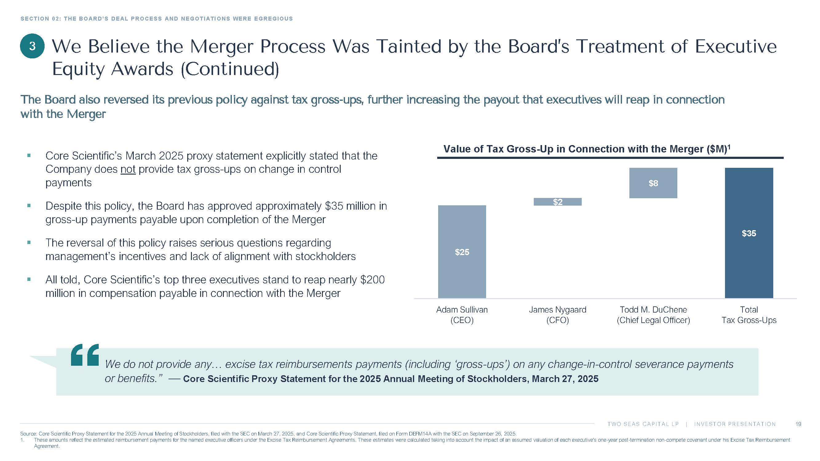 TWO SEAS CAPITAL LP | INVESTOR PRESENTATION SECTION 02: THE BOARD’S DEAL PROCESS AND NEGOTIATIONS WERE EGREGIOUS 19 Source: Core Scientific Proxy Statement for the 2025 Annual Meeting of Stockholders, filed with the SEC on March 27, 2025, an d C ore Scientific Proxy Statement, filed on Form DEFM14A with the SEC on September 26, 2025. 1. These amounts reflect the estimated reimbursement payments for the named executive officers under the Excise Tax Reimbursemen t A greements. These estimates were calculated taking into account the impact of an assumed valuation of each executive’s one - year p ost - termination non - compete covenant under his Excise Tax Reimbursement Agreement. We Believe the Merger Process Was Tainted by the Board’s Treatment of Executive Equity Awards (Continued) The Board also reversed its previous policy against tax gross - ups, further increasing the payout that executives will reap in co nnection with the Merger 3 We do not provide any… excise tax reimbursements payments (including ‘gross - ups’) on any change - in - control severance payments or benefits.” — Core Scientific Proxy Statement for the 2025 Annual Meeting of Stockholders, March 27, 2025 Value of Tax Gross - Up in Connection with the Merger ($M) 1 $25 $2 $8 $35 Adam Sullivan (CEO) James Nygaard (CFO) Todd M. DuChene (Chief Legal Officer) Total Tax Gross-Ups ▪ Core Scientific’s March 2025 proxy statement explicitly stated that the Company does not provide tax gross - ups on change in control payments ▪ Despite this policy, the Board has approved approximately $35 million in gross - up payments payable upon completion of the Merger ▪ The reversal of this policy raises serious questions regarding management’s incentives and lack of alignment with stockholders ▪ All told, Core Scientific’s top three executives stand to reap nearly $200 million in compensation payable in connection with the Merger