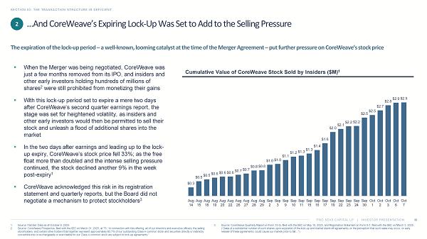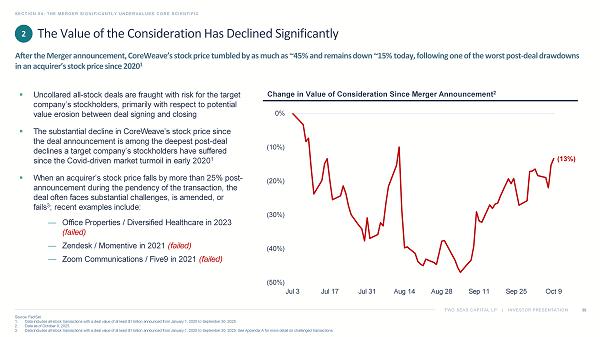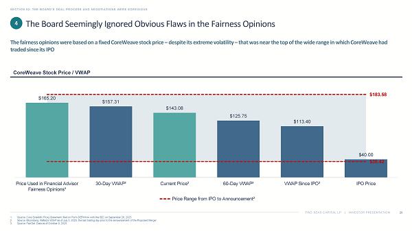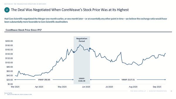 TWO SEAS CAPITAL LP | INVESTOR PRESENTATION SECTION 03: THE TRANSACTION STRUCTURE IS DEFICIENT 30 1. Source: FactSet. Data as of October 9, 2025. 2. Source: CoreWeave Prospectus, filed with the SEC on March 31, 2025, at 75: “In connection with this offering, all of our dire cto rs and executive officers, the selling stockholders, and certain other holders that together represent approximately 83.7% of our outstanding Class A common stock a nd securities directly or indirectly convertible into or exchangeable or exercisable for our Class A common stock are subject to lock - up agreements.” 3. Source: CoreWeave Quarterly Report on Form 10 - Q, filed with the SEC on May 15, 2025, and Registration Statement on Form S - 1, fil ed with the SEC on March 3, 2025 (“Sales of a substantial number of such shares upon expiration of the lock - up and market stand - off agreements, or the perception that such sales may occur, or early release of these agreements, could cause our market price to fall…”). The expiration of the lock - up period – a well - known, looming catalyst at the time of the Merger Agreement – put further pressure on CoreWeave’s stock price ▪ When the Merger was being negotiated, CoreWeave was just a few months removed from its IPO, and insiders and other early investors holding hundreds of millions of shares 2 were still prohibited from monetizing their gains ▪ With this lock - up period set to expire a mere two days after CoreWeave’s second quarter earnings report, the stage was set for heightened volatility, as insiders and other early investors would then be permitted to sell their stock and unleash a flood of additional shares into the market ▪ In the two days after earnings and leading up to the lock - up expiry, CoreWeave’s stock price fell 33%; as the free float more than doubled and the intense selling pressure continued, the stock declined another 9% in the week post - expiry 1 ▪ CoreWeave acknowledged this risk in its registration statement and quarterly reports, but the Board did not negotiate a mechanism to protect stockholders 3 Cumulative Value of CoreWeave Stock Sold by Insiders ($M) 1 …And CoreWeave’s Expiring Lock - Up Was Set to Add to the Selling Pressure 2 $0.3 $0.5 $0.5 $0.6 $0.6 $0.6 $0.7 $0.7 $0.8 $0.8 $1.0 $1.0 $1.1 $1.2 $1.3 $1.3 $1.4 $1.6 $2.0 $2.1 $2.2 $2.2 $2.5 $2.5 $2.7 $2.8 $2.9 $2.9 Aug 14 Aug 15 Aug 18 Aug 19 Aug 20 Aug 22 Aug 26 Aug 27 Aug 28 Aug 29 Sep 2 Sep 3 Sep 9 Sep 10 Sep 11 Sep 15 Sep 16 Sep 17 Sep 19 Sep 22 Sep 23 Sep 24 Sep 30 Oct 1 Oct 2 Oct 3 Oct 6 Oct 7
