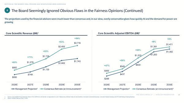 TWO SEAS CAPITAL LP | INVESTOR PRESENTATION SECTION 02: THE BOARD’S DEAL PROCESS AND NEGOTIATIONS WERE EGREGIOUS 21 1. Source: Core Scientific Proxy Statement, filed on Form DEFM14A with the SEC on September 26, 2025. Reflects the combined tota ls of Core Scientific’s Colocation Contracted Business, Colocation Pipeline Business and BTC Self Mining & Hosting Business. 2. Source: FactSet. Data as of July 3, 2025. Core Scientific Adjusted EBITDA ($M) 1 Core Scientific Revenue ($M) 1 4 The Board Seemingly Ignored Obvious Flaws in the Fairness Opinions (Continued) The projections used by the financial advisors were much lower than consensus and, in our view, overly conservative given how qu ickly AI and the demand for power are growing $249 $437 $830 $1,263 $1,382 $365 $549 $1,010 $1,381 $1,471 2026E 2027E 2028E 2029E 2030E Management Projection¹ Consensus Estimate (at Announcement)² $550 $748 $1,130 $1,602 $1,743 $882 $1,278 $1,729 $2,450 $2,716 2026E 2027E 2028E 2029E 2030E Management Projection¹ Consensus Estimate (at Announcement)² +60% +71% +53% +53% +56% +47% +26% +22% +9% +6%