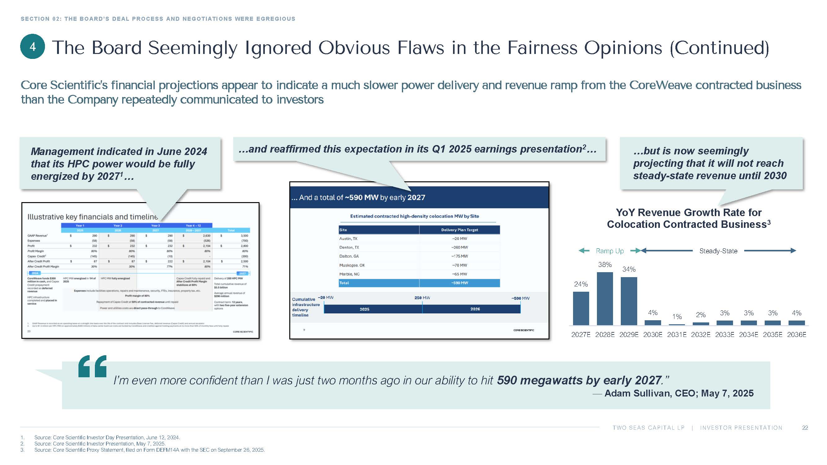 TWO SEAS CAPITAL LP | INVESTOR PRESENTATION 24% 38% 34% 4% 1% 2% 3% 3% 3% 4% 2027E 2028E 2029E 2030E 2031E 2032E 2033E 2034E 2035E 2036E YoY Revenue Growth Rate for Colocation Contracted Business 3 SECTION 02: THE BOARD’S DEAL PROCESS AND NEGOTIATIONS WERE EGREGIOUS 22 1. Source: Core Scientific Investor Day Presentation, June 12, 2024. 2. Source: Core Scientific Investor Presentation, May 7, 2025. 3. Source: Core Scientific Proxy Statement, filed on Form DEFM14A with the SEC on September 26, 2025. 4 Management indicated in June 2024 that its HPC power would be fully energized by 2027 1 … …and reaffirmed this expectation in its Q1 2025 earnings presentation 2 … …but is now seemingly projecting that it will not reach steady - state revenue until 2030 Ramp Up Steady - State I’m even more confident than I was just two months ago in our ability to hit 590 megawatts by early 2027 .” — Adam Sullivan , CEO; May 7, 2025 The Board Seemingly Ignored Obvious Flaws in the Fairness Opinions (Continued) Core Scientific’s financial projections appear to indicate a much slower power delivery and revenue ramp from the CoreWeave c ont racted business than the Company repeatedly communicated to investors