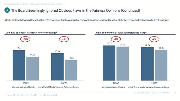 TWO SEAS CAPITAL LP | INVESTOR PRESENTATION SECTION 02: THE BOARD’S DEAL PROCESS AND NEGOTIATIONS WERE EGREGIOUS 24 1. Source: Core Scientific Proxy Statement, filed on Form DEFM14A with the SEC on September 26, 2025. 4 High End of Moelis’ Valuation Reference Range 1 Low End of Moelis’ Valuation Reference Range 1 17.8x 16.0x 14.0x 12.0x 2026E 2027E Lowest Valuation Multiple Low End of Moelis' Valuation Reference Range 20.7x 19.6x 20.0x 18.0x 2026E 2027E Highest Valuation Multiple High End of Moelis' Valuation Reference Range - 21% - 25% - 3% - 8% The Board Seemingly Ignored Obvious Flaws in the Fairness Opinions (Continued) Moelis arbitrarily lowered the valuation reference range for its comparable companies analysis, making the value of the Merge r c onsideration look better than it was
