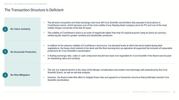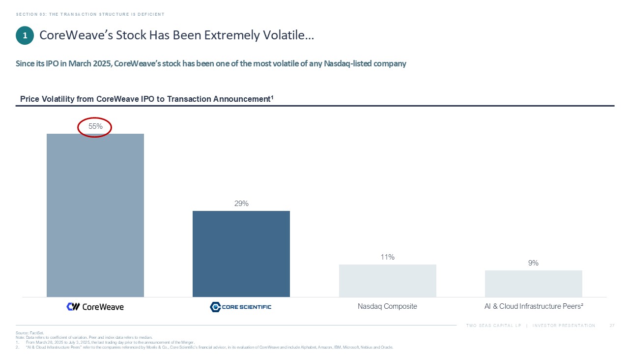 TWO SEAS CAPITAL LP | INVESTOR PRESENTATION The Transaction Structure Is Deficient SECTION 03: THE TRANSACTION STRUCTURE IS DEFICIENT 26 ▪ The all - stock transaction and fixed exchange ratio have left Core Scientific stockholders fully exposed to fluctuations in CoreWeave’s stock, which has been one of the most volatile of any Nasdaq - listed company since its IPO and one of the most volatile merger currencies of the last 25 years ▪ The volatility of CoreWeave’s stock is an order of magnitude higher than that of a typical acquirer using its stock as curren cy, reinforcing the need for greater certainty and stockholder protection No Value Certainty ▪ In addition to the extreme volatility of CoreWeave’s stock price, the elevated levels at which the stock traded during deal negotiations, the heavy short interest in the stock and the then - looming lock - up expiration all supported the inclusion of reaso nable protections for Core Scientific’s stockholders ▪ A floating exchange ratio, collar or cash component should have been non - negotiable for Core Scientific if the Board was focused on maximizing value and certainty No Downside Protection ▪ The risk of a material decline in the value of the Merger consideration was evident and seemingly well understood by the Core Scientific Board, as well as sell - side analysts ▪ However, the Board made little effort to mitigate these risks and agreed to a transaction structure that predictably harmed C ore Scientific stockholders No Risk Mitigation 1 2 3
