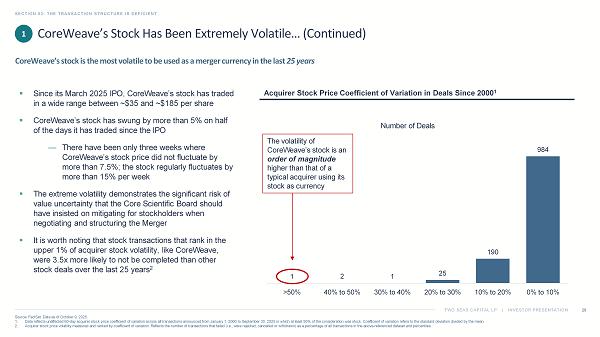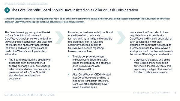 TWO SEAS CAPITAL LP | INVESTOR PRESENTATION SECTION 03: THE TRANSACTION STRUCTURE IS DEFICIENT 33 Source: Core Scientific Proxy Statement, filed on Form DEFM14A with the SEC on September 26, 2025. The Board seemingly recognized the risk to Core Scientific stockholders if CoreWeave’s stock price were to decline between the announcement and closing of the Merger and apparently appreciated the trading and market dynamics that made CoreWeave’s stock particularly vulnerable ▪ The Board discussed the possibility of proposing cash consideration, a floating exchange ratio, an exchange ratio collar and other mechanisms to preserve value for Core Scientific stockholders on at least four occasions The Core Scientific Board Should Have Insisted on a Collar or Cash Consideration Structural safeguards such as a floating exchange ratio, collar or cash component would have insulated Core Scientific stockh old ers from the fluctuations and material decline in CoreWeave’s stock price that have occurred post - deal announcement 3 However, as best we can tell, the Board made little effort to advocate for mechanisms to mitigate the tangible and significant risk to value and seemingly acceded quickly to CoreWeave’s desires regarding transaction structure ▪ The Merger proxy statement indicates Core Scientific’s CEO raised the possibility of a collar just once in discussions with CoreWeave’s CEO ▪ After CoreWeave’s CEO indicated that CoreWeave was unwilling to modify the transaction structure, Core Scientific apparently never raised the issue again In our view, the Board should have negotiated more forcefully with CoreWeave and insisted on a collar or cash consideration to protect stockholders from what we regard as a foreseeable risk that CoreWeave’s stock price would decline and diminish the value of the Merger consideration ▪ CoreWeave’s stock is one of the most volatile of any acquisition currency in the last 25 years; this is precisely the type of transaction for which collars were invented