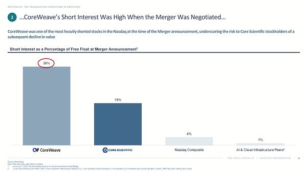 TWO SEAS CAPITAL LP | INVESTOR PRESENTATION …CoreWeave’s Short Interest Was High When the Merger Was Negotiated… SECTION 03: THE TRANSACTION STRUCTURE IS DEFICIENT 29 Source: Bloomberg. Note: Peer and index data refers to median. 1. As of July 3, 2025, the last trading day prior to the announcement of the Merger. 2. “AI & Cloud Infrastructure Peers” refer to the companies referenced by Moelis & Co., Core Scientific’s financial advisor, in its evaluation of CoreWeave and include Alphabet, Amazon, IBM, Microsoft, Nebius and Oracle. CoreWeave was one of the most heavily shorted stocks in the Nasdaq at the time of the Merger announcement, underscoring the r isk to Core Scientific stockholders of a subsequent decline in value Short Interest as a Percentage of Free Float at Merger Announcement 1 2 36% 19% 4% 1% Nasdaq Composite AI & Cloud Infrastructure Peers²