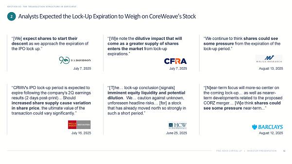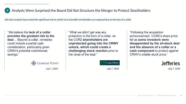 TWO SEAS CAPITAL LP | INVESTOR PRESENTATION SECTION 03: THE TRANSACTION STRUCTURE IS DEFICIENT 32 “We continue to think shares could see some pressure from the expiration of the lock - up period.” August 13, 2025 “[W]e note the dilutive impact that will come as a greater supply of shares enters the market from lock - up expirations.” July 7, 2025 “[We] expect shares to start their descent as we approach the expiration of the IPO lock up.” July 7, 2025 “[N]ear - term focus will more - so center on the coming lock - up… as well as nearer - term developments related to the proposed CORZ merger… [W]e think shares could see some pressure near - term...” August 12, 2025 “[T]he… lock - up conclusion [signals] imminent equity liquidity and potential dilution . We… caution against unknown, unforeseen headline risks… [for] a stock that has already moved north so strongly in such a short period.” June 25, 2025 “CRWV's IPO lock - up period is expected to expire following the company's 2Q earnings results (2 days post - print)... Should increased share supply cause variation in share price , the ultimate value of the transaction could vary significantly.” July 16, 2025 Analysts Expected the Lock - Up Expiration to Weigh on CoreWeave’s Stock 2