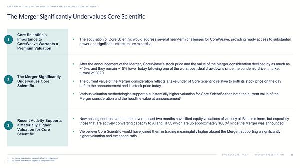 TWO SEAS CAPITAL LP | INVESTOR PRESENTATION The Merger Significantly Undervalues Core Scientific SECTION 04: THE MERGER SIGNIFICANTLY UNDERVALUES CORE SCIENTIFIC 36 1. As further described on pages 40 - 47 of this presentation. 2. As further described on page 64 of this presentation. ▪ The acquisition of Core Scientific would address several near - term challenges for CoreWeave, providing ready access to substanti al power and significant infrastructure expertise Core Scientific’s Importance to CoreWeave Warrants a Premium Valuation ▪ After the announcement of the Merger, CoreWeave’s stock price and the value of the Merger consideration declined by as much a s ~45%, and they remain ~15% lower today following one of the worst post - deal drawdowns since the pandemic - driven market turmoil of 2020 ▪ The current value of the Merger consideration reflects a take - under of Core Scientific relative to both its stock price on the d ay before the announcement and its stock price today ▪ Various valuation methodologies support a substantially higher valuation for Core Scientific than both the current value of t he Merger consideration and the headline value at announcement 1 The Merger Significantly Undervalues Core Scientific ▪ New hosting contracts announced over the last two months have lifted equity valuations of virtually all Bitcoin miners, but e spe cially those that are actively converting capacity to AI and HPC, which are up approximately 180% 2 since the Merger was announced ▪ We believe Core Scientific would have joined them in trading meaningfully higher absent the Merger, supporting a significantl y higher valuation and exchange ratio Recent Activity Supports a Materially Higher Valuation for Core Scientific 1 2 3