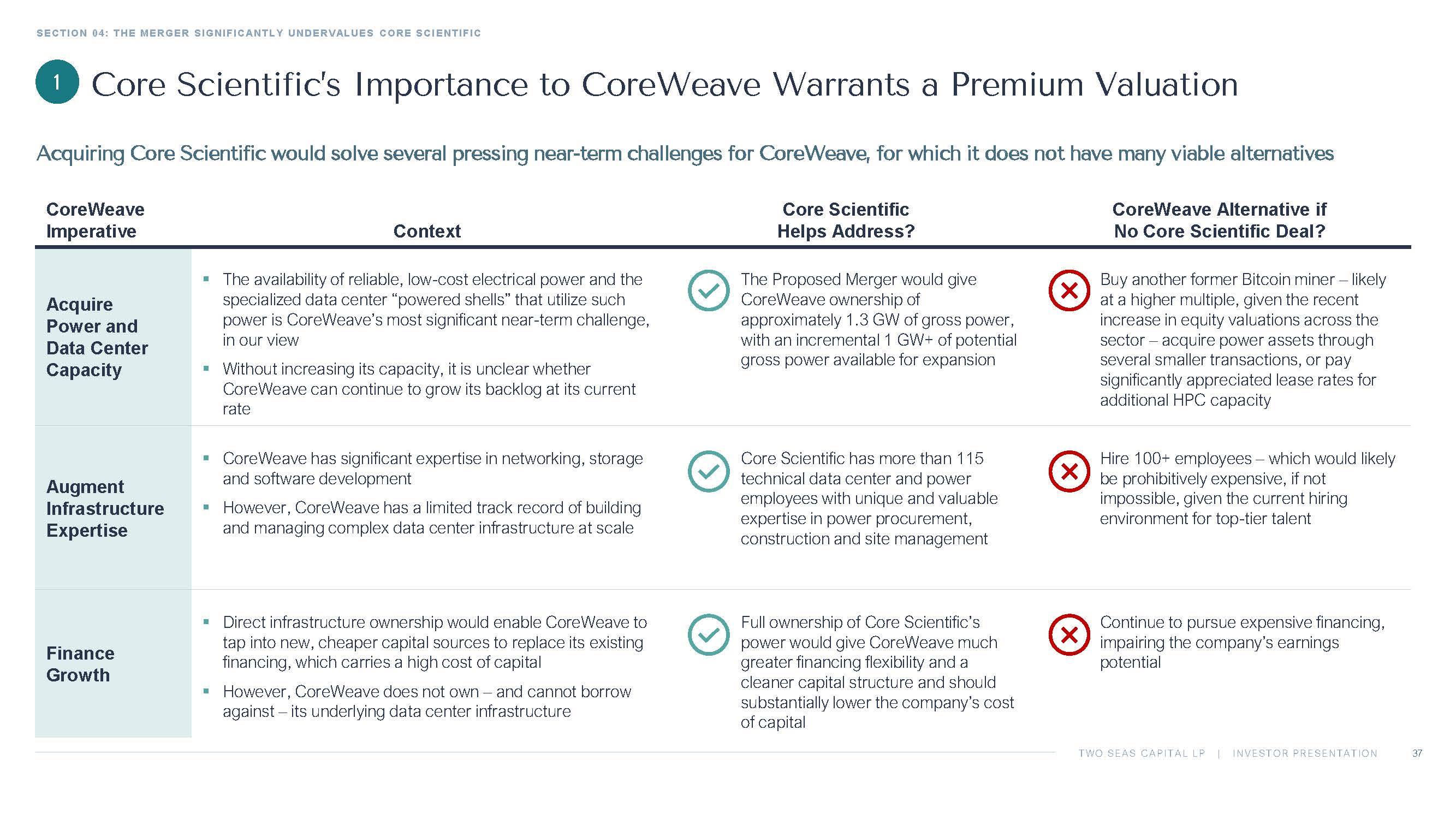 TWO SEAS CAPITAL LP | INVESTOR PRESENTATION SECTION 04: THE MERGER SIGNIFICANTLY UNDERVALUES CORE SCIENTIFIC 37 CoreWeave Alternative if No Core Scientific Deal? Core Scientific Helps Address? Context CoreWeave Imperative Buy another former Bitcoin miner – likely at a higher multiple, given the recent increase in equity valuations across the sector – acquire power assets through several smaller transactions, or pay significantly appreciated lease rates for additional HPC capacity The Proposed Merger would give CoreWeave ownership of approximately 1.3 GW of gross power, with an incremental 1 GW+ of potential gross power available for expansion ▪ The availability of reliable, low - cost electrical power and the specialized data center “powered shells” that utilize such power is CoreWeave’s most significant near - term challenge, in our view ▪ Without increasing its capacity, it is unclear whether CoreWeave can continue to grow its backlog at its current rate Acquire Power and Data Center Capacity Hire 100+ employees – which would likely be prohibitively expensive, if not impossible, given the current hiring environment for top - tier talent Core Scientific has more than 115 technical data center and power employees with unique and valuable expertise in power procurement, construction and site management ▪ CoreWeave has significant expertise in networking, storage and software development ▪ However, CoreWeave has a limited track record of building and managing complex data center infrastructure at scale Augment Infrastructure Expertise Continue to pursue expensive financing, impairing the company’s earnings potential Full ownership of Core Scientific’s power would give CoreWeave much greater financing flexibility and a cleaner capital structure and should substantially lower the company’s cost of capital ▪ Direct infrastructure ownership would enable CoreWeave to tap into new, cheaper capital sources to replace its existing financing, which carries a high cost of capital ▪ However, CoreWeave does not own – and cannot borrow against – its underlying data center infrastructure Finance Growth 1 Core Scientific’s Importance to CoreWeave Warrants a Premium Valuation Acquiring Core Scientific would solve several pressing near - term challenges for CoreWeave, for which it does not have many viabl e alternatives