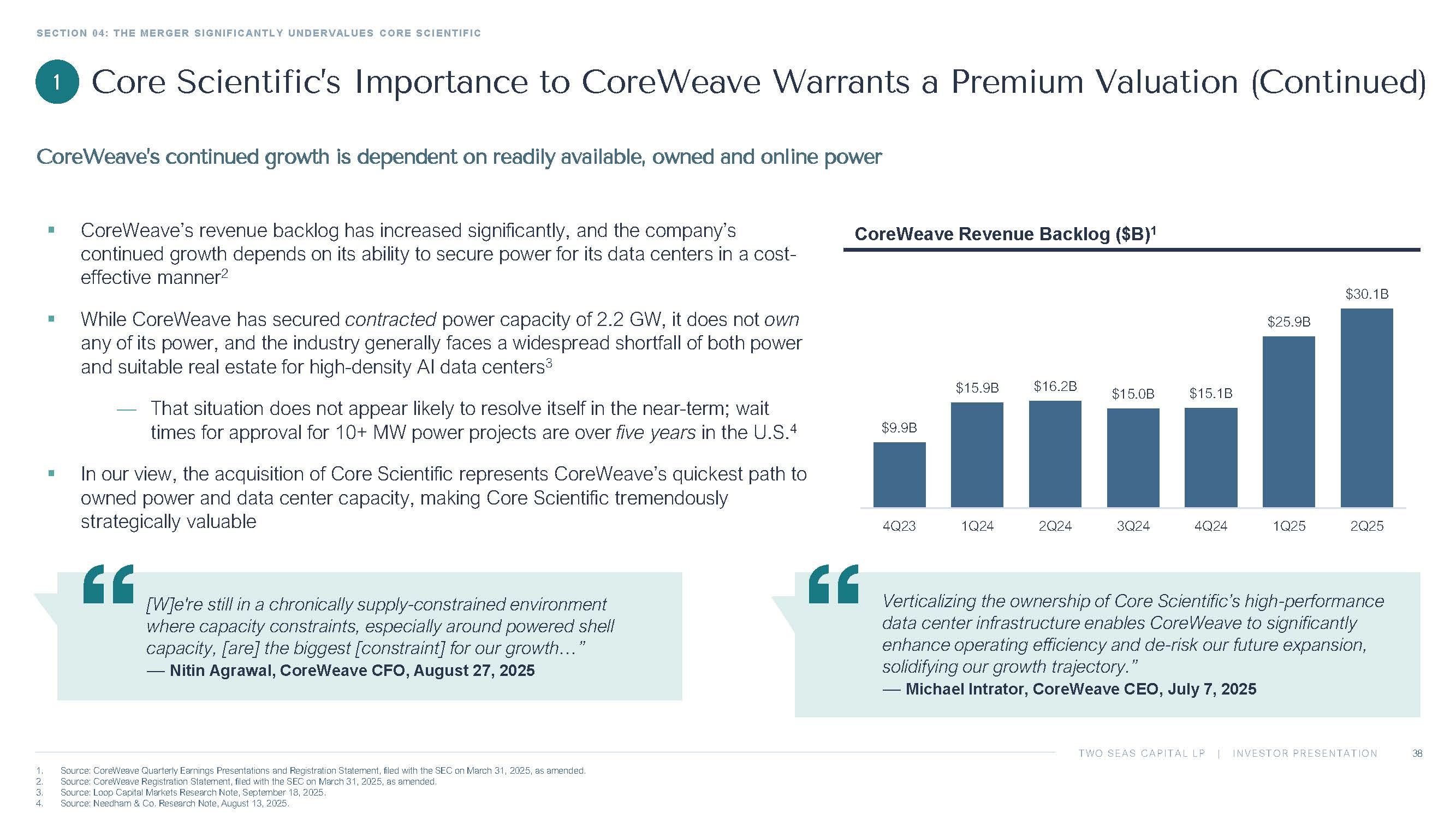 TWO SEAS CAPITAL LP | INVESTOR PRESENTATION SECTION 04: THE MERGER SIGNIFICANTLY UNDERVALUES CORE SCIENTIFIC 38 1. Source: CoreWeave Quarterly Earnings Presentations and Registration Statement, filed with the SEC on March 31, 2025, as amend ed. 2. Source: CoreWeave Registration Statement, filed with the SEC on March 31, 2025, as amended. 3. Source: Loop Capital Markets Research Note, September 18, 2025. 4. Source: Needham & Co. Research Note, August 13, 2025. CoreWeave Revenue Backlog ($B) 1 Core Scientific’s Importance to CoreWeave Warrants a Premium Valuation (Continued) CoreWeave’s continued growth is dependent on readily available, owned and online power $9.9B $15.9B $16.2B $15.0B $15.1B $25.9B $30.1B 4Q23 1Q24 2Q24 3Q24 4Q24 1Q25 2Q25 ▪ CoreWeave’s revenue backlog has increased significantly, and the company’s continued growth depends on its ability to secure power for its data centers in a cost - effective manner 2 ▪ While CoreWeave has secured contracted power capacity of 2.2 GW, it does not own any of its power, and the industry generally faces a widespread shortfall of both power and suitable real estate for high - density AI data centers 3 — That situation does not appear likely to resolve itself in the near - term; wait times for approval for 10+ MW power projects are over five years in the U.S. 4 ▪ In our view, the acquisition of Core Scientific represents CoreWeave’s quickest path to owned power and data center capacity, making Core Scientific tremendously strategically valuable 1 [W] e're still in a chronically supply - constrained environment where capacity constraints, especially around powered shell capacity, [are] the biggest [constraint] for our growth…” — Nitin Agrawal, CoreWeave CFO, August 27, 2025 Verticalizing the ownership of Core Scientific’s high - performance data center infrastructure enables CoreWeave to significantly enhance operating efficiency and de - risk our future expansion, solidifying our growth trajectory.” — Michael Intrator , CoreWeave CEO, July 7, 2025