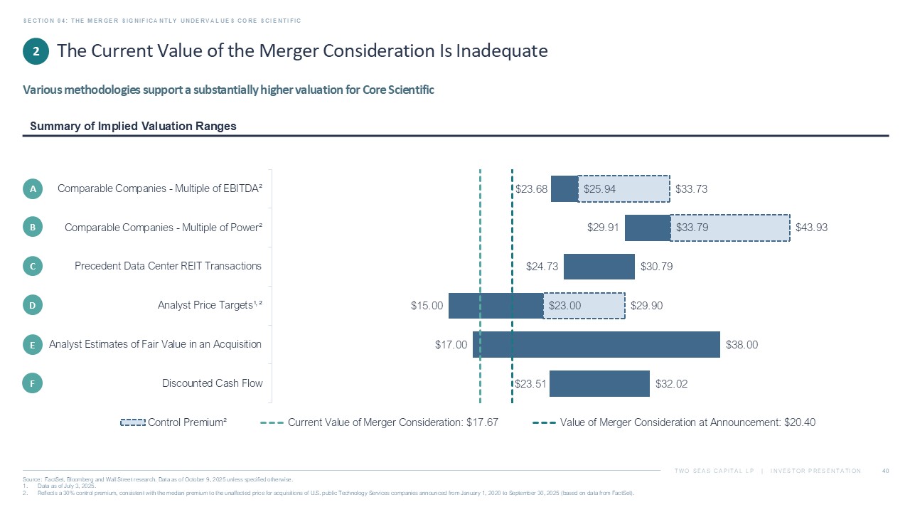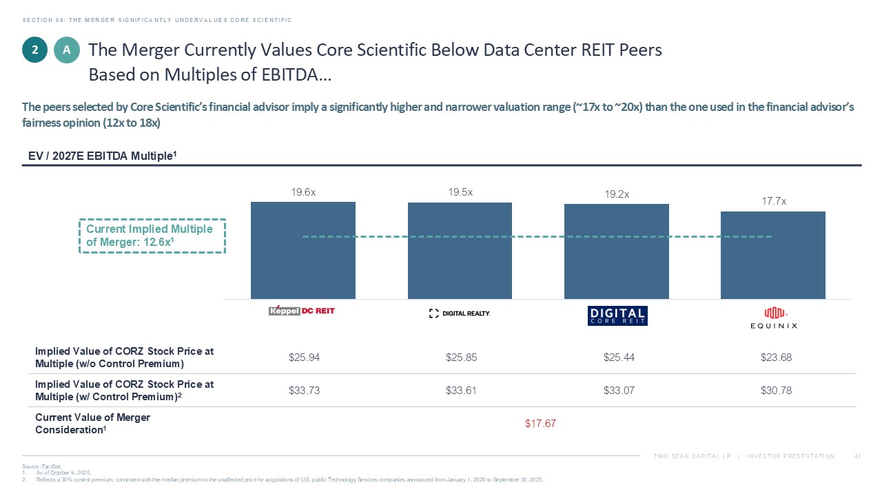 TWO SEAS CAPITAL LP | INVESTOR PRESENTATION SECTION 04: THE TRANSACTION SIGNIFICANTLY UNDERVALUES CORE SCIENTIFIC 40 Source: FactSet, Bloomberg and Wall Street research. Data as of October 9, 2025 unless specified otherwise. 1. Data as of July 3, 2025. 2. Reflects a 30% control premium, consistent with the median premium to the unaffected price for acquisitions of U.S. public Te chn ology Services companies announced from January 1, 2020 to September 30, 2025 (based on data from FactSet). Summary of Implied Valuation Ranges The Current Value of the Merger Consideration Is Inadequate Various methodologies support a substantially higher valuation for Core Scientific 2 A B C D E F , $23.63 $29.91 $24.73 $15.00 $17.00 $23.51 $25.93 $33.79 $30.79 $23.00 $38.00 $32.02 $33.71 $43.93 $29.90 $0.00 $10.00 $20.00 $30.00 $40.00 $50.00 Comparable Companies - Multiple of EBITDA² Comparable Companies - Multiple of Power² Precedent Data Center REIT Transactions Analyst Price Targets¹ ² Analyst Estimates of Fair Value in an Acquisition Discounted Cash Flow Control Premium² Current Value of Merger Consideration: $17.67 Value of Merger Consideration at Announcement: $20.40