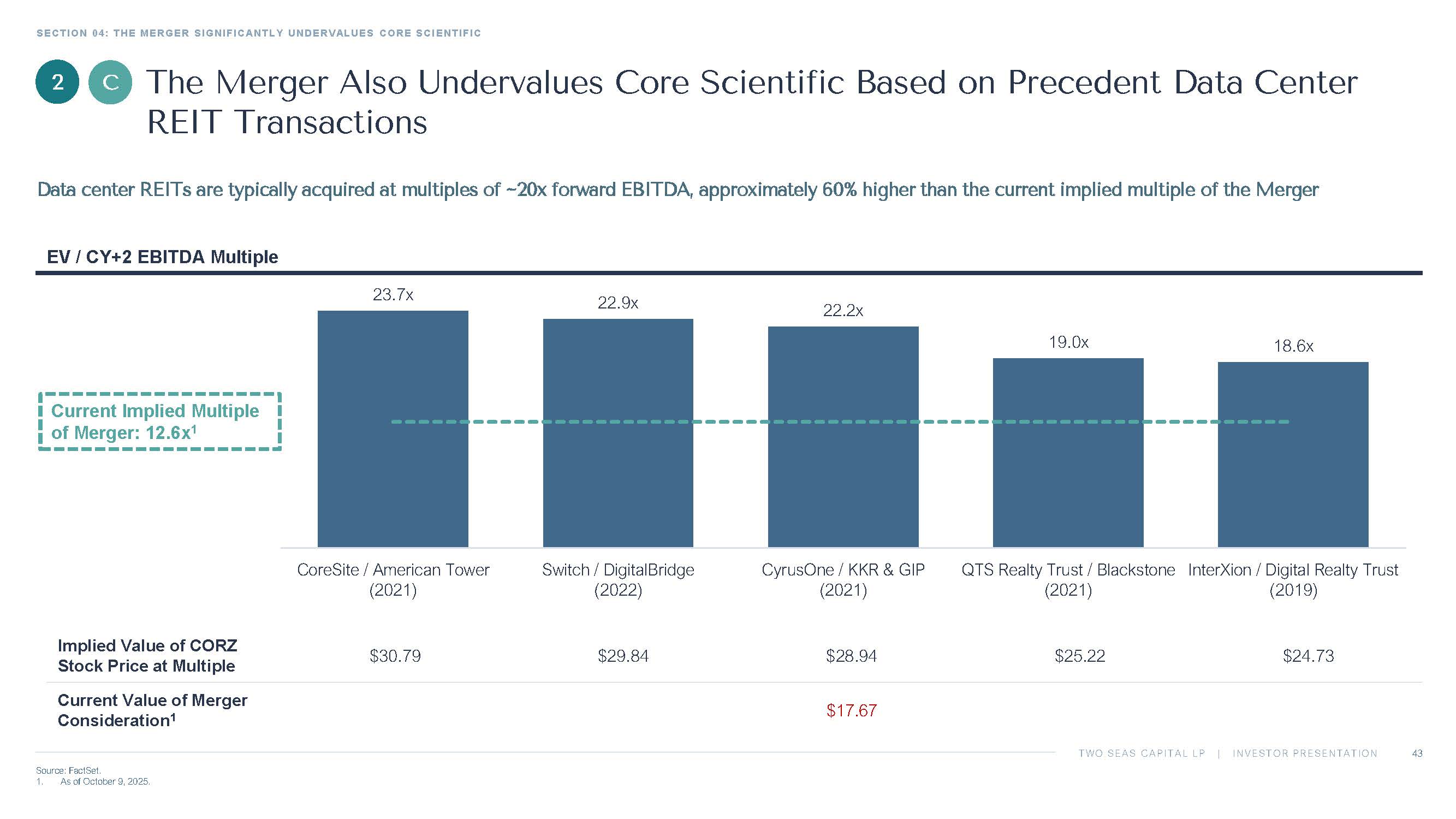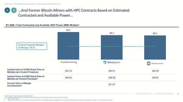 TWO SEAS CAPITAL LP | INVESTOR PRESENTATION $23.63 $25.44 $25.77 $25.93 Implied Value of CORZ Stock Price at Multiple (w/o Control Premium) $30.72 $33.07 $33.50 $33.71 Implied Value of CORZ Stock Price at Multiple (w/ Control Premium) 2 $17.67 Current Value of Merger Consideration 1 Current Implied Multiple of Merger: 12.6x 1 SECTION 04: THE MERGER SIGNIFICANTLY UNDERVALUES CORE SCIENTIFIC Source: FactSet. 1. As of October 9, 2025. 2. Reflects a 30% control premium, consistent with the median premium to the unaffected price for acquisitions of U.S. public Te chn ology Services companies announced from January 1, 2020 to September 30, 2025. EV / 2027E EBITDA Multiple 1 41 2 A The Merger Currently Values Core Scientific Below Data Center REIT Peers Based on Multiples of EBITDA… The peers selected by Core Scientific’s financial advisor imply a significantly higher and narrower valuation range (~17x to ~20 x) than the one used in the financial advisor’s fairness opinion (12x to 18x) 19.6x 19.5x 19.2x 17.7x KPDCF-US DLR-US DGTCF-US EQIX-US