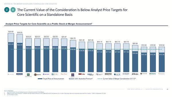TWO SEAS CAPITAL LP | INVESTOR PRESENTATION SECTION 04: THE MERGER SIGNIFICANTLY UNDERVALUES CORE SCIENTIFIC 44 Source: Bloomberg. 1. As of July 3, 2025, the last trading day prior to the announcement of the Merger. 2. Reflects a 30% control premium, consistent with the median premium to the unaffected price for acquisitions of U.S. public Te chn ology Services companies announced from January 1, 2020 to September 30, 2025. 3. As of October 9, 2025. Analyst Price Targets for Core Scientific as a Public Stock at Merger Announcement 1 C The Current Value of the Consideration Is Below Analyst Price Targets for Core Scientific on a Standalone Basis 2 D $23.00 $22.50 $20.00 $20.00 $20.00 $20.00 $19.90 $19.00 $18.00 $18.00 $17.00 $17.00 $17.00 $17.00 $16.00 $15.00 $15.00 $15.00 $29.90 $29.25 $26.00 $26.00 $26.00 $26.00 $25.87 $24.70 $23.40 $23.40 $22.10 $22.10 $22.10 $22.10 $20.80 $19.50 $19.50 $19.50 1 2 3 4 5 6 7 8 9 10 11 12 13 14 15 16 17 18 Target Price at Announcement +30% Illustrative Premium² Current Value of Merger Consideration: $17.67³