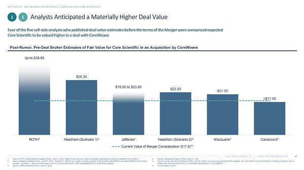 TWO SEAS CAPITAL LP | INVESTOR PRESENTATION Analysts Anticipated a Materially Higher Deal Value SECTION 04: THE MERGER SIGNIFICANTLY UNDERVALUES CORE SCIENTIFIC 45 1. Source: ROTH Capital Partners Research Note, June 26, 2025. Refers to the maximum value CoreWeave could pay and have the tran sac tion be accretive. 2. Source: Needham Research Note, June 27, 2025. “Scenario 1” refers to an “upside” scenario in which Core Scientific has $990M in annualized EBITDA at full online capacity; “Scenario 2” refers to a base case in which Core Scientific has $719M in annualized EBITDA at full online capacity. 3. Source: Jefferies Research Note, June 27, 2025. 4. Source: Macquarie Research Note, June 26, 2025. 5. Source: Canaccord Genuity Research Note, June 26, 2025 (“Our previously published DCF assigned ~$17 per share for [Core Scien tif ic’s] AI hosting contracts, but we believe they could be worth more to CoreWeave than they are to Core Scientific.”). 6. As of October 9, 2025. Post - Rumor, Pre - Deal Broker Estimates of Fair Value for Core Scientific in an Acquisition by CoreWeave Four of the five sell - side analysts who published deal value estimates before the terms of the Merger were announced expected Core Scientific to be valued higher in a deal with CoreWeave 2 E Up to $38.00 $28.30 $16.00 to $23.00 $22.00 $21.00 >$17.00 ROTH¹ Needham (Scenario 1)² Jefferies³ Needham (Scenario 2)² Macquarie ⁴ Canaccord ⁵ Current Value of Merger Consideration: $17.67 ⁶