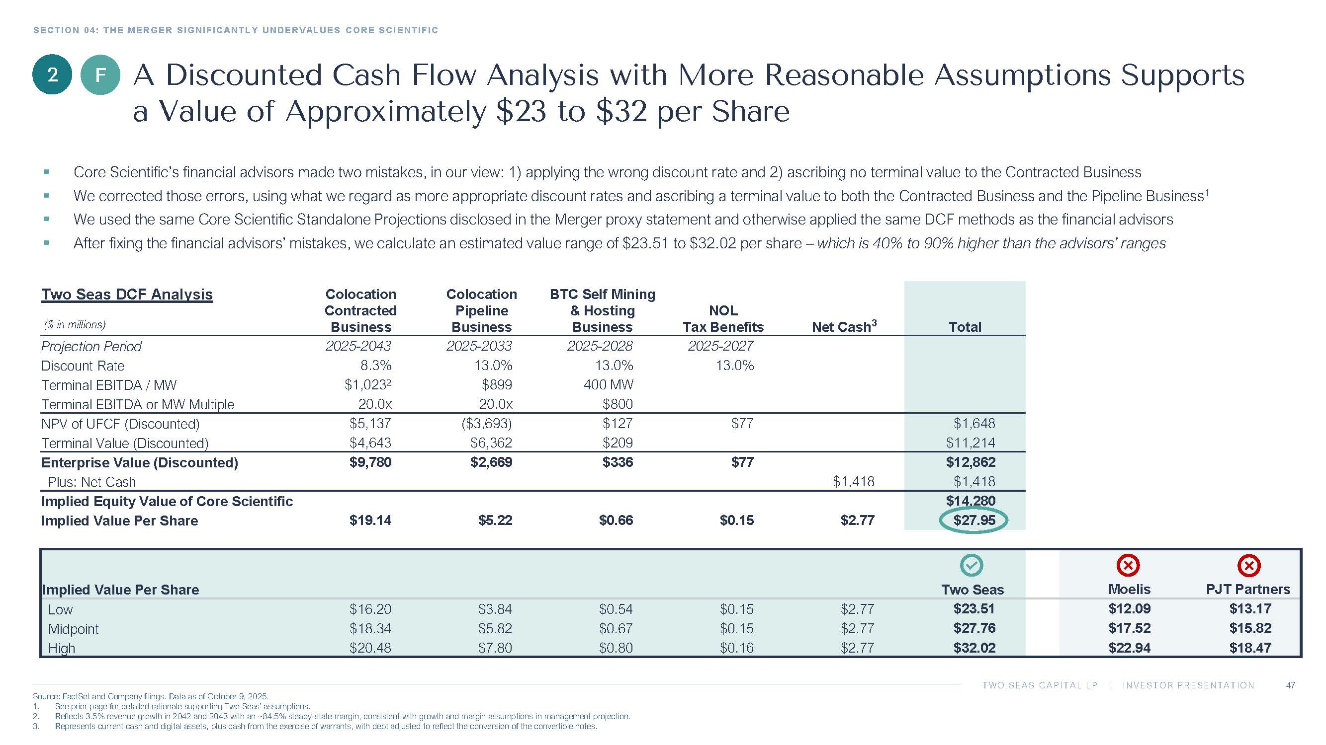 TWO SEAS CAPITAL LP | INVESTOR PRESENTATION SECTION 04: THE MERGER SIGNIFICANTLY UNDERVALUES CORE SCIENTIFIC Source: FactSet and Company filings. Data as of October 9, 2025. 1. See prior page for detailed rationale supporting Two Seas’ assumptions. 2. Reflects 3.5% revenue growth in 2042 and 2043 with an ~84.5% steady - state margin, consistent with growth and margin assumptions in management projection. 3. Represents current cash and digital assets, plus cash from the exercise of warrants, with debt adjusted to reflect the conver sio n of the convertible notes. 47 2 A Discounted Cash Flow Analysis with More Reasonable Assumptions Supports a Value of Approximately $23 to $32 per Share Total Net Cash 3 NOL Tax Benefits BTC Self Mining & Hosting Business Colocation Pipeline Business Colocation Contracted Business Two Seas DCF Analysis ($ in millions) 2025 - 2027 2025 - 2028 2025 - 2033 2025 - 2043 Projection Period 13.0% 13.0% 13.0% 8.3% Discount Rate 400 MW $899 $1,023 2 Terminal EBITDA / MW $800 20.0x 20.0x Terminal EBITDA or MW Multiple $1,648 $77 $127 ($3,693) $5,137 NPV of UFCF (Discounted) $11,214 $209 $6,362 $4,643 Terminal Value (Discounted) $12,862 $77 $336 $2,669 $9,780 Enterprise Value (Discounted) $1,418 $1,418 Plus: Net Cash $14,280 Implied Equity Value of Core Scientific $27.95 $2.77 $0.15 $0.66 $5.22 $19.14 Implied Value Per Share PJT Partners Moelis Two Seas Implied Value Per Share $13.17 $12.09 $23.51 $2.77 $0.15 $0.54 $3.84 $16.20 Low $15.82 $17.52 $27.76 $2.77 $0.15 $0.67 $5.82 $18.34 Midpoint $18.47 $22.94 $32.02 $2.77 $0.16 $0.80 $7.80 $20.48 High F ▪ Core Scientific’s financial advisors made two mistakes, in our view: 1) applying the wrong discount rate and 2) ascribing no ter minal value to the Contracted Business ▪ We corrected those errors, using what we regard as more appropriate discount rates and ascribing a terminal value to both the Co ntracted Business and the Pipeline Business 1 ▪ We used the same Core Scientific Standalone Projections disclosed in the Merger proxy statement and otherwise applied the sam e D CF methods as the financial advisors ▪ After fixing the financial advisors’ mistakes, we calculate an estimated value range of $23.51 to $32.02 per share – which is 40% to 90% higher than the advisors’ ranges