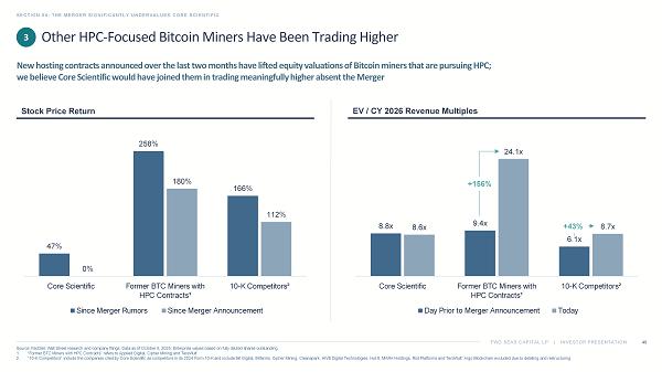 TWO SEAS CAPITAL LP | INVESTOR PRESENTATION SECTION 04: THE MERGER SIGNIFICANTLY UNDERVALUES CORE SCIENTIFIC 48 Source: FactSet, Wall Street research and company filings. Data as of October 9, 2025. Enterprise values based on fully dilut ed shares outstanding. 1. “Former BTC Miners with HPC Contracts” refers to Applied Digital, Cipher Mining and TeraWulf . 2. “10 - K Competitors” include the companies cited by Core Scientific as competitors in its 2024 Form 10 - K and include Bit Digital, Bitfarms, Cipher Mining, Cleanspark , HIVE Digital Technologies, Hut 8, MARA Holdings, Riot Platforms and TeraWulf . Argo Blockchain excluded due to delisting and restructuring. Other HPC - Focused Bitcoin Miners Have Been Trading Higher New hosting contracts announced over the last two months have lifted equity valuations of Bitcoin miners that are pursuing HP C; we believe Core Scientific would have joined them in trading meaningfully higher absent the Merger EV / CY 2026 Revenue Multiples Stock Price Return 3 47% 258% 166% 0% 180% 112% Core Scientific Former BTC Miners with HPC Contracts¹ 10-K Competitors² Since Merger Rumors Since Merger Announcement 8.8x 9.4x 6.1x 8.6x 24.1x 8.7x Core Scientific Former BTC Miners with HPC Contracts¹ 10-K Competitors² Day Prior to Merger Announcement Today +156% +43%