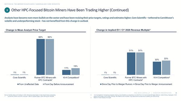 TWO SEAS CAPITAL LP | INVESTOR PRESENTATION SECTION 04: THE MERGER SIGNIFICANTLY UNDERVALUES CORE SCIENTIFIC Source: FactSet. Data as of October 9, 2025. Enterprise values based on fully diluted shares outstanding. 1. “Former BTC Miners with HPC Contracts” refers to Applied Digital, Cipher Mining and TeraWulf . 2. “10 - K Competitors” include the companies cited by Core Scientific as competitors in its 2024 Form 10 - K and include Bit Digital, Bitfarms, Cipher Mining, Cleanspark , HIVE Digital Technologies, Hut 8, MARA Holdings, Riot Platforms and TeraWulf . Argo Blockchain excluded due to delisting and restructuring. 3. Based on mean analyst price target. Other HPC - Focused Bitcoin Miners Have Been Trading Higher (Continued) Analysts have become even more bullish on the sector and have been revising their price targets, ratings and estimates higher ; C ore Scientific – tethered to CoreWeave’s volatile and underperforming stock – has not benefited from this change in outlook Change in Implied EV / CY 2026 Revenue Multiple 3 Change in Mean Analyst Price Target 3 49 1% 82% 11% 1% 82% 15% Core Scientific Former BTC Miners with HPC Contracts¹ 10-K Competitors² From Unaffected Date From Day Before Announcement 1% 51% 30% 1% 51% 33% Core Scientific Former BTC Miners with HPC Contracts¹ 10-K Competitors² Since Day Prior to Merger Rumors Since Day Prior to Merger Announcement