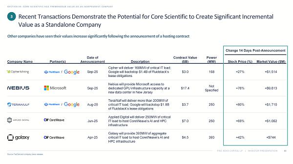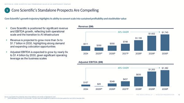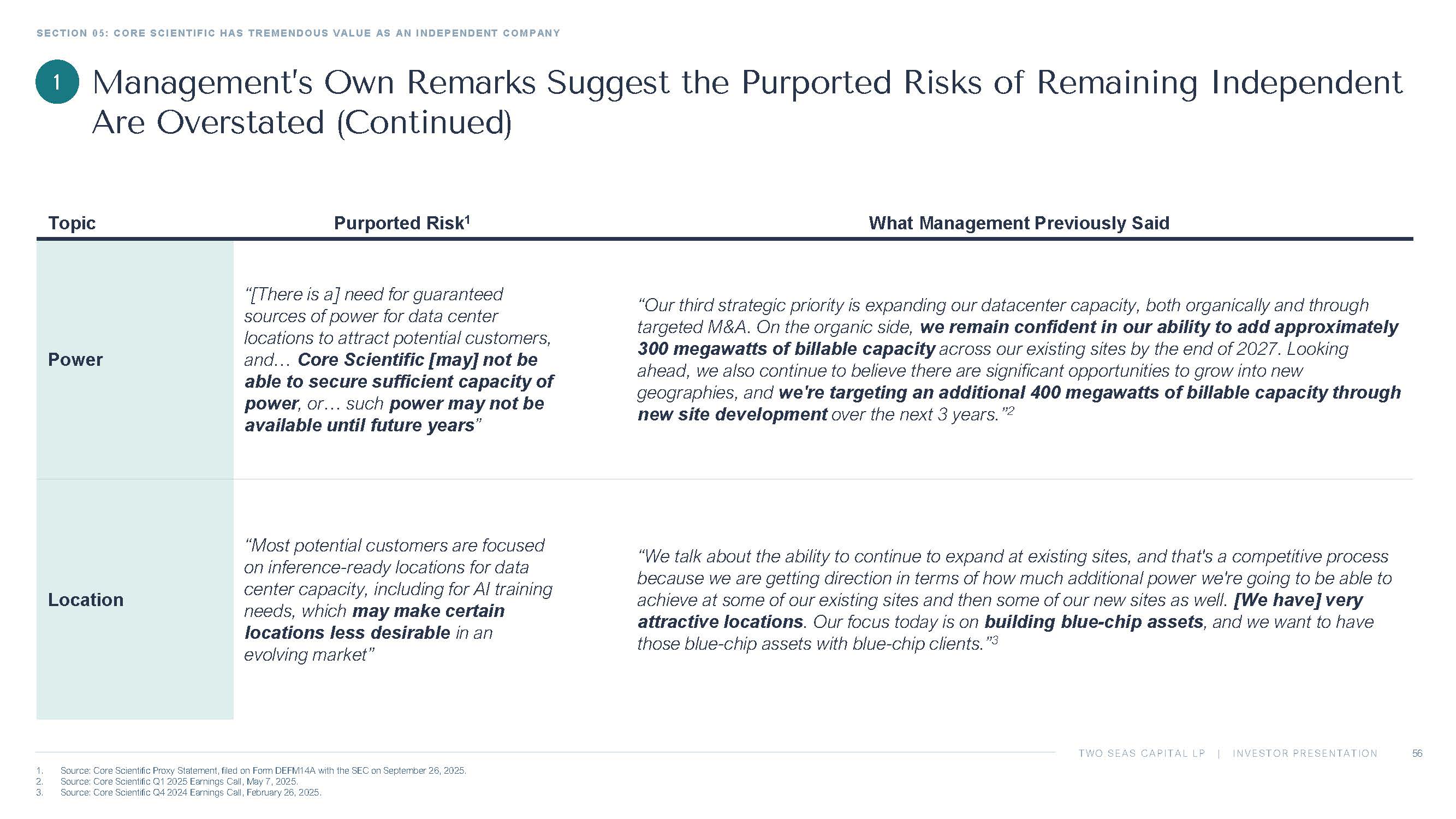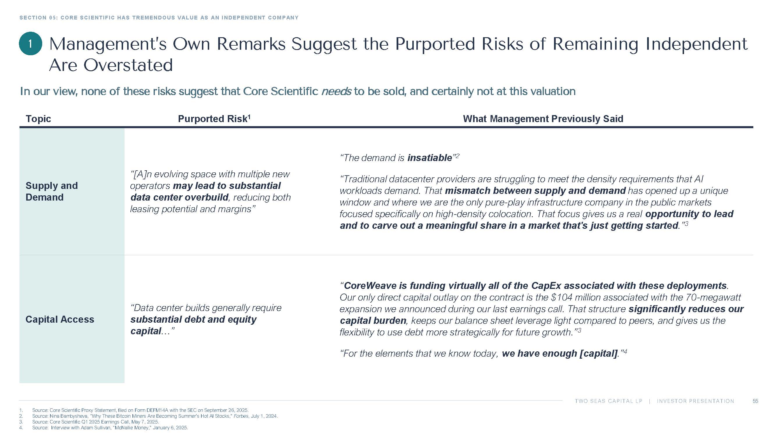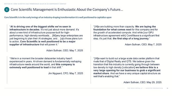 TWO SEAS CAPITAL LP | INVESTOR PRESENTATION SECTION 05: CORE SCIENTIFIC HAS TREMENDOUS VALUE AS AN INDEPENDENT COMPANY 55 1. Source: Core Scientific Proxy Statement, filed on Form DEFM14A with the SEC on September 26, 2025. 2. Source: Nina Bambysheva , “Why These Bitcoin Miners Are Becoming Summer’s Hot AI Stocks,” Forbes , July 1, 2024. 3. Source: Core Scientific Q1 2025 Earnings Call, May 7, 2025. 4. Source: Interview with Adam Sullivan, “ McNallie Money,” January 6, 2025. In our view, none of these risks suggest that Core Scientific needs to be sold, and certainly not at this valuation What Management Previously Said Purported Risk 1 Topic “The demand is insatiable ” 2 “Traditional datacenter providers are struggling to meet the density requirements that AI workloads demand. That mismatch between supply and demand has opened up a unique window and where we are the only pure - play infrastructure company in the public markets focused specifically on high - density colocation. That focus gives us a real opportunity to lead and to carve out a meaningful share in a market that's just getting started .” 3 “[A]n evolving space with multiple new operators may lead to substantial data center overbuild , reducing both leasing potential and margins” Supply and Demand “ CoreWeave is funding virtually all of the CapEx associated with these deployments . Our only direct capital outlay on the contract is the $104 million associated with the 70 - megawatt expansion we announced during our last earnings call. That structure significantly reduces our capital burden , keeps our balance sheet leverage light compared to peers, and gives us the flexibility to use debt more strategically for future growth.” 3 “For the elements that we know today, we have enough [capital] .” 4 “Data center builds generally require substantial debt and equity capital …” Capital Access Management’s Own Remarks Suggest the Purported Risks of Remaining Independent Are Overstated 1