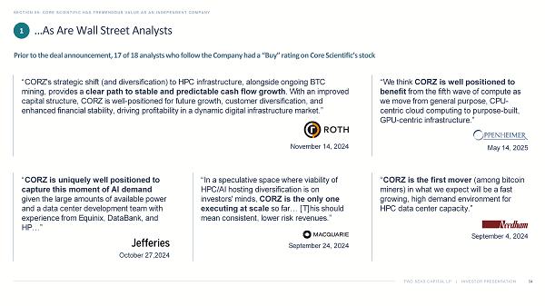 TWO SEAS CAPITAL LP | INVESTOR PRESENTATION …As Are Wall Street Analysts SECTION 05: CORE SCIENTIFIC HAS TREMENDOUS VALUE AS AN INDEPENDENT COMPANY 54 Prior to the deal announcement, 17 of 18 analysts who follow the Company had a “Buy” rating on Core Scientific’s stock “We think CORZ is well positioned to benefit from the fifth wave of compute as we move from general purpose, CPU - centric cloud computing to purpose - built, GPU - centric infrastructure.” May 14, 2025 “CORZ's strategic shift (and diversification) to HPC infrastructure, alongside ongoing BTC mining, provides a clear path to stable and predictable cash flow growth . With an improved capital structure, CORZ is well - positioned for future growth, customer diversification, and enhanced financial stability, driving profitability in a dynamic digital infrastructure market.” November 14, 2024 “ CORZ is the first mover (among bitcoin miners) in what we expect will be a fast growing, high demand environment for HPC data center capacity.” September 4, 2024 “In a speculative space where viability of HPC/AI hosting diversification is on investors' minds, CORZ is the only one executing at scale so far… [T]his should mean consistent, lower risk revenues.” September 24, 2024 “ CORZ is uniquely well positioned to capture this moment of AI demand given the large amounts of available power and a data center development team with experience from Equinix, DataBank , and HP…” October 27,2024 1
