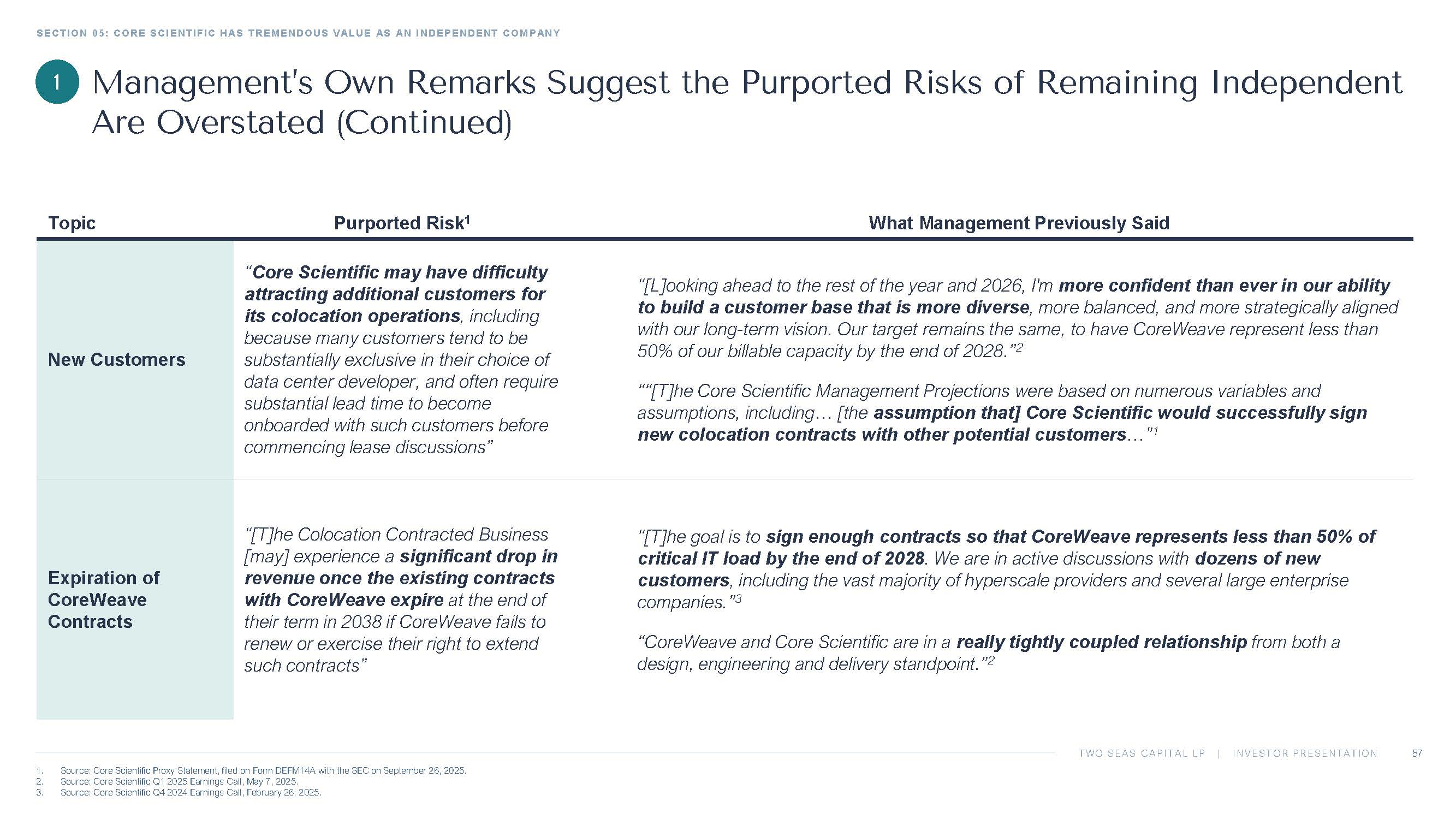 TWO SEAS CAPITAL LP | INVESTOR PRESENTATION SECTION 05: CORE SCIENTIFIC HAS TREMENDOUS VALUE AS AN INDEPENDENT COMPANY 56 1. Source: Core Scientific Proxy Statement, filed on Form DEFM14A with the SEC on September 26, 2025. 2. Source: Core Scientific Q1 2025 Earnings Call, May 7, 2025. 3. Source: Core Scientific Q4 2024 Earnings Call, February 26, 2025. What Management Previously Said Purported Risk 1 Topic “Our third strategic priority is expanding our datacenter capacity, both organically and through targeted M&A. On the organic side, we remain confident in our ability to add approximately 300 megawatts of billable capacity across our existing sites by the end of 2027. Looking ahead, we also continue to believe there are significant opportunities to grow into new geographies, and we're targeting an additional 400 megawatts of billable capacity through new site development over the next 3 years.” 2 “[There is a] need for guaranteed sources of power for data center locations to attract potential customers, and… Core Scientific [may] not be able to secure sufficient capacity of power , or… such power may not be available until future years ” Power “We talk about the ability to continue to expand at existing sites, and that's a competitive process because we are getting direction in terms of how much additional power we're going to be able to achieve at some of our existing sites and then some of our new sites as well. [We have] very attractive locations . Our focus today is on building blue - chip assets , and we want to have those blue - chip assets with blue - chip clients.” 3 “Most potential customers are focused on inference - ready locations for data center capacity, including for AI training needs, which may make certain locations less desirable in an evolving market” Location Management’s Own Remarks Suggest the Purported Risks of Remaining Independent Are Overstated (Continued) 1