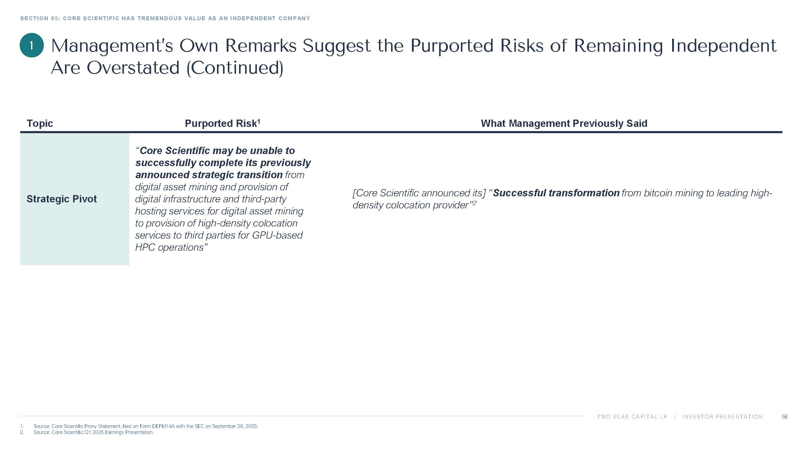 TWO SEAS CAPITAL LP | INVESTOR PRESENTATION SECTION 05: CORE SCIENTIFIC HAS TREMENDOUS VALUE AS AN INDEPENDENT COMPANY 58 1. Source: Core Scientific Proxy Statement, filed on Form DEFM14A with the SEC on September 26, 2025. 2. Source: Core Scientific Q1 2025 Earnings Presentation. What Management Previously Said Purported Risk 1 Topic [Core Scientific announced its] “ Successful transformation from bitcoin mining to leading high - density colocation provider” 2 “ Core Scientific may be unable to successfully complete its previously announced strategic transition from digital asset mining and provision of digital infrastructure and third - party hosting services for digital asset mining to provision of high - density colocation services to third parties for GPU - based HPC operations” Strategic Pivot Management’s Own Remarks Suggest the Purported Risks of Remaining Independent Are Overstated (Continued) 1