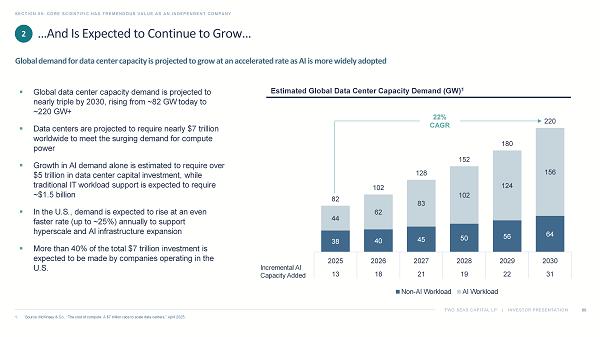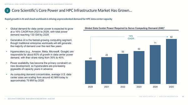 TWO SEAS CAPITAL LP | INVESTOR PRESENTATION Core Scientific’s Core Power and HPC Infrastructure Market Has Grown… SECTION 05: CORE SCIENTIFIC HAS TREMENDOUS VALUE AS AN INDEPENDENT COMPANY 59 1. Source: Boston Consulting Group, “Breaking Barriers to Data Center Growth,” January 2025. Rapid growth in AI and cloud workloads is driving unprecedented demand for HPC data center capacity 43 49 55 60 71 82 2020 2021 2022 2023 2024 2025 14% CAGR 2 ▪ Global demand for data center power is expected to grow at a 16% CAGR from 2023 to 2028, with total power demand reaching 130 GW by 2028 ▪ Generative AI is the fastest - growing computing segment, though traditional enterprise workloads will still generate the majority of demand over the next few years ▪ Hyperscalers (e.g., Amazon, Meta, Microsoft, Google) are responsible for about 60% of growth in data center power demand, with their share rising from 35% to 45% ▪ Power availability has become the primary constraint on new development, so hyperscalers are pre - leasing gigawatts of capacity years in advance ▪ As computing demand concentrates, average U.S. data center sizes are scaling from around 40 MW today to approximately 70 MW by 2028 Global Data Center Power Required to Serve Computing Demand (GW) 1