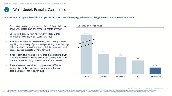 TWO SEAS CAPITAL LP | INVESTOR PRESENTATION …While Supply Remains Constrained SECTION 05: CORE SCIENTIFIC HAS TREMENDOUS VALUE AS AN INDEPENDENT COMPANY 61 1. Source: Blackstone, “Cutting ThroughSource : Blackstone, “Cutting Through the Noise: The Long - Term Case for Data Centers,” May 2025. Underlying data is as of December 31, 2024 and is derived from CoStar (Office, Retail), CBRE (Logistics), RealPage Market Analytics (Multifamily) and datacenterHawk (Data Centers). 2. Source: CBRE, “Data Centers: U.S. Real Estate Market Outlook 2025.” the Noise: The Long - Term Case for Data Centers,” May 2025. Underlying data is as of December 31, 2024 and is derived from CoStar (Office, Retail), CBRE (Logistics), RealPage Market Ana lyt ics (Multifamily) and datacenterHawk (Data Centers). Land scarcity, zoning hurdles and limited speculative construction are keeping real estate supply tight even as data center d ema nd soars ▪ Data center vacancy rates across the U.S. have fallen to below 2%, tighter than any other real estate category ▪ Speculative construction has largely halted, further increasing the difficulty to secure new sites ▪ In primary markets like Northern Virginia, developers are requiring the entirety of power and permitting to be lined up before breaking ground, causing only fully pre - leased and capital - backed projects to move forward ▪ In fast - expanding markets like Atlanta, data center growth is so aggressive that zoning bodies are pushing back and, in some cases, blocking development of new centers ▪ Pre - leasing rates are at record highs (near 90%) and competition for land is intense, so new supply gets absorbed faster than it’s even built 2 23% 6% 5% 4% <2% Office Logistics Multifamily Retail Data Centers 2 Vacancy by Asset Class 1