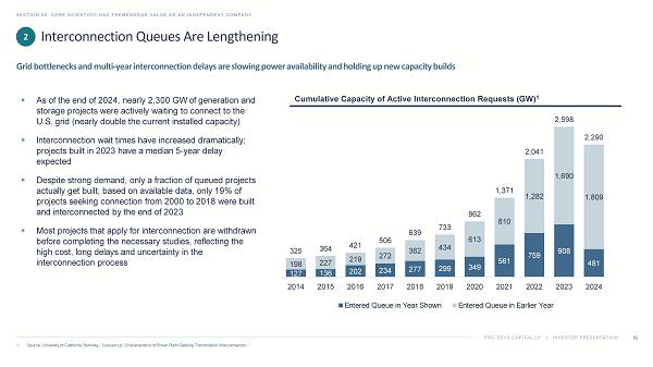 TWO SEAS CAPITAL LP | INVESTOR PRESENTATION Interconnection Queues Are Lengthening SECTION 05: CORE SCIENTIFIC HAS TREMENDOUS VALUE AS AN INDEPENDENT COMPANY 62 1. Source: University of California, Berkeley,” Queued Up: Characteristics of Power Plans Seeking Transmission Interconnection.” Grid bottlenecks and multi - year interconnection delays are slowing power availability and holding up new capacity builds ▪ As of the end of 2024, nearly 2,300 GW of generation and storage projects were actively waiting to connect to the U.S. grid (nearly double the current installed capacity) ▪ Interconnection wait times have increased dramatically; projects built in 2023 have a median 5 - year delay expected ▪ Despite strong demand, only a fraction of queued projects actually get built; based on available data, only 19% of projects seeking connection from 2000 to 2018 were built and interconnected by the end of 2023 ▪ Most projects that apply for interconnection are withdrawn before completing the necessary studies, reflecting the high cost, long delays and uncertainty in the interconnection process 127 136 202 234 277 299 349 561 759 908 481 198 227 219 272 362 434 613 810 1,282 1,690 1,809 325 364 421 506 639 733 962 1,371 2,041 2,598 2,290 2014 2015 2016 2017 2018 2019 2020 2021 2022 2023 2024 Entered Queue in Year Shown Entered Queue in Earlier Year 2 Cumulative Capacity of Active Interconnection Requests (GW) 1