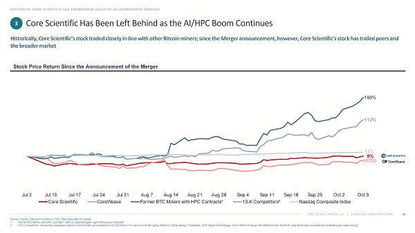 TWO SEAS CAPITAL LP | INVESTOR PRESENTATION Core Scientific Has Been Left Behind as the AI/ HPC Boom Continues SECTION 05: CORE SCIENTIFIC HAS TREMENDOUS VALUE AS AN INDEPENDENT COMPANY 64 Source: FactSet. Data as of October 9, 2025. Peer data refers to median. 1. “Former BTC Miners with HPC Contracts” refers to Applied Digital, Cipher Mining and TeraWulf . 2. “10 - K Competitors” include the companies cited by Core Scientific as competitors in its 2024 Form 10 - K and include Bit Digital, Bitfarms, Cipher Mining, Cleanspark , HIVE Digital Technologies, Hut 8, MARA Holdings, Riot Platforms and TeraWulf . Argo Blockchain excluded due to delisting and restructuring. Historically, Core Scientific’s stock traded closely in - line with other Bitcoin miners; since the Merger announcement, however, Core Scientific’s stock has trailed peers and the broader market 3 Stock Price Return Since the Announcement of the Merger 0% (13%) 180% 112% 12% Jul 3 Jul 10 Jul 17 Jul 24 Jul 31 Aug 7 Aug 14 Aug 21 Aug 28 Sep 4 Sep 11 Sep 18 Sep 25 Oct 2 Oct 9 Core Scientific CoreWeave Former BTC Miners with HPC Contracts¹ 10-K Competitors² Nasdaq Composite Index