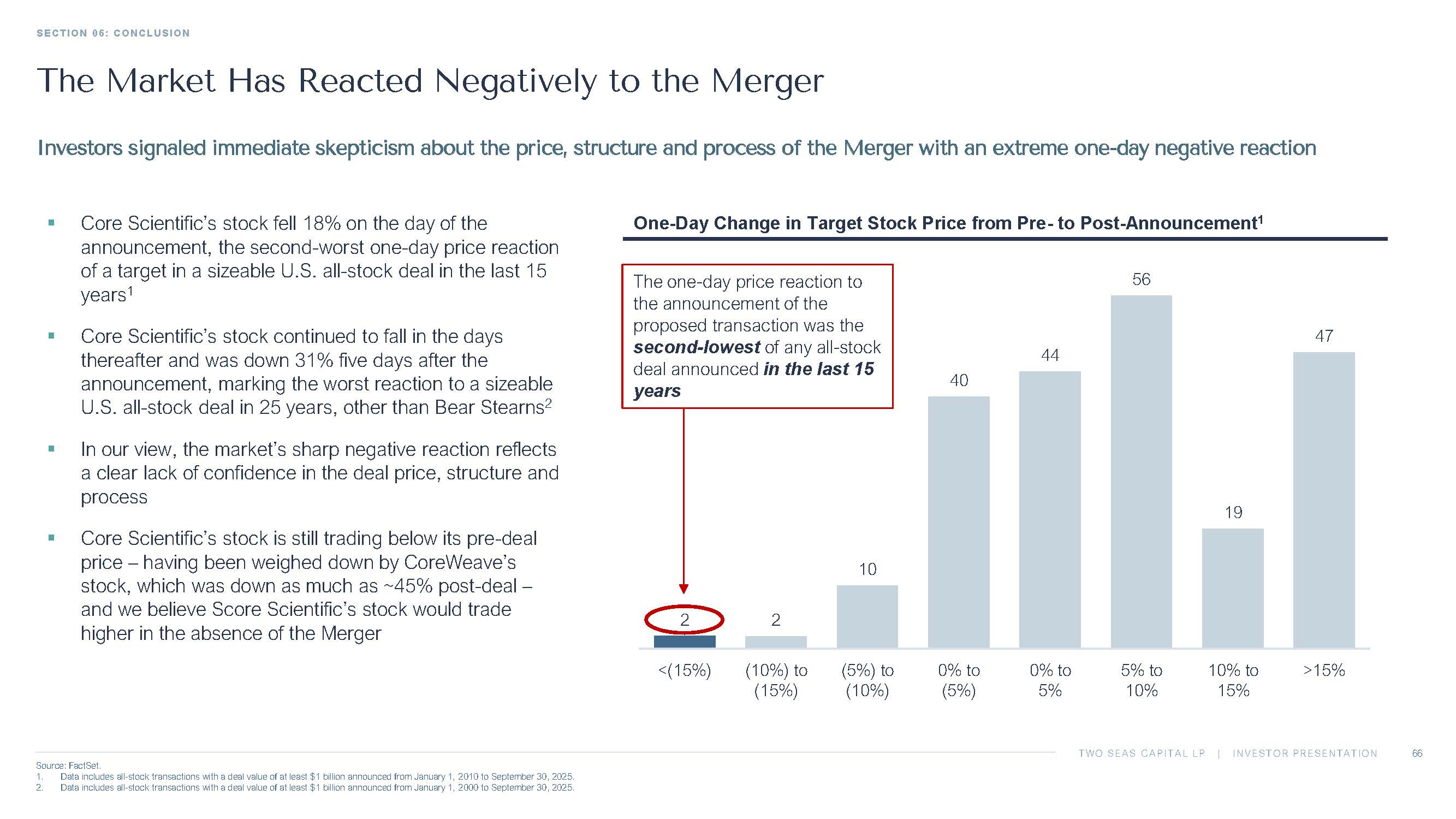 TWO SEAS CAPITAL LP | INVESTOR PRESENTATION The Market Has Reacted Negatively to the Merger 66 Source: FactSet. 1. Data includes all - stock transactions with a deal value of at least $1 billion announced from January 1, 2010 to September 30, 20 25. 2. Data includes all - stock transactions with a deal value of at least $1 billion announced from January 1, 2000 to September 30, 20 25. Investors signaled immediate skepticism about the price, structure and process of the Merger with an extreme one - day negative re action One - Day Change in Target Stock Price from Pre - to Post - Announcement 1 ▪ Core Scientific’s stock fell 18% on the day of the announcement, the second - worst one - day price reaction of a target in a sizeable U.S. all - stock deal in the last 15 years 1 ▪ Core Scientific’s stock continued to fall in the days thereafter and was down 31% five days after the announcement, marking the worst reaction to a sizeable U.S. all - stock deal in 25 years, other than Bear Stearns 2 ▪ In our view, the market’s sharp negative reaction reflects a clear lack of confidence in the deal price, structure and process ▪ Core Scientific’s stock is still trading below its pre - deal price – having been weighed down by CoreWeave’s stock, which was down as much as ~45% post - deal – and we believe Score Scientific’s stock would trade higher in the absence of the Merger 2 2 10 40 44 56 19 47 <(15%) (10%) to (15%) (5%) to (10%) 0% to (5%) 0% to 5% 5% to 10% 10% to 15% >15% The one - day price reaction to the announcement of the proposed transaction was the second - lowest of any all - stock deal announced in the last 15 years SECTION 06: CONCLUSION