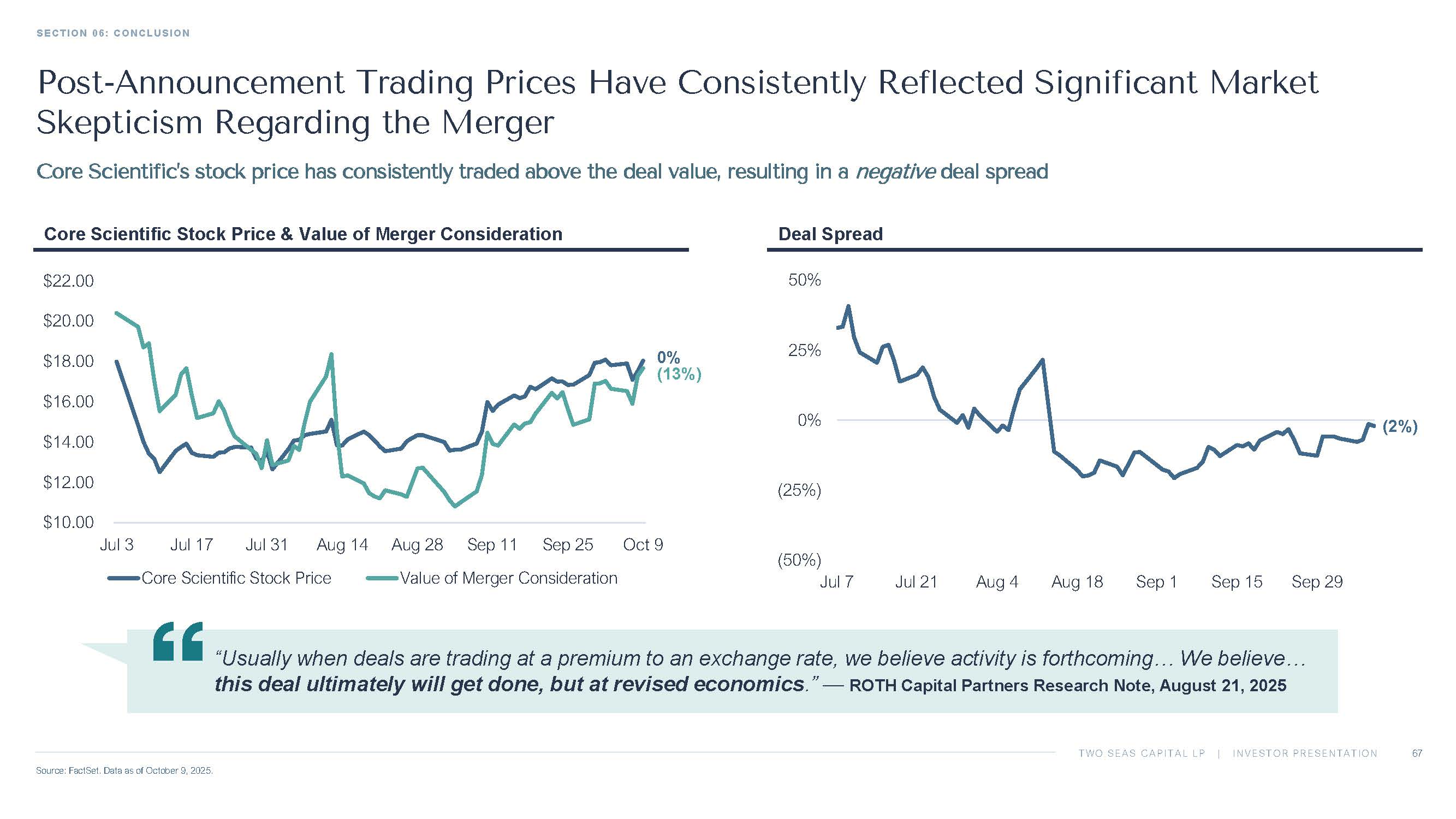 TWO SEAS CAPITAL LP | INVESTOR PRESENTATION SECTION 06: CONCLUSION 67 Source: FactSet. Data as of October 9, 2025. Deal Spread Core Scientific Stock Price & Value of Merger Consideration Post - Announcement Trading Prices Have Consistently Reflected Significant Market Skepticism Regarding the Merger Core Scientific’s stock price has consistently traded above the deal value, resulting in a negative deal spread “Usually when deals are trading at a premium to an exchange rate, we believe activity is forthcoming… We believe… this deal ultimately will get done, but at revised economics . ” — ROTH Capital Partners Research Note, August 21, 2025 $10.00 $12.00 $14.00 $16.00 $18.00 $20.00 $22.00 Jul 3 Jul 17 Jul 31 Aug 14 Aug 28 Sep 11 Sep 25 Oct 9 Core Scientific Stock Price Value of Merger Consideration 0% (13%) (2%) (50%) (25%) 0% 25% 50% Jul 7 Jul 21 Aug 4 Aug 18 Sep 1 Sep 15 Sep 29