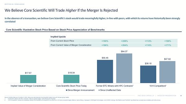 TWO SEAS CAPITAL LP | INVESTOR PRESENTATION SECTION 06: CONCLUSION 69 Source: FactSet. Data as of October 9, 2025. Stock price data assumes Core Scientific trades in - line with the peer group median. 1. “Former BTC Miners with HPC Contracts” refers to Applied Digital, Cipher Mining and TeraWulf . 2. “10 - K Competitors” include the companies cited by Core Scientific as competitors in its 2024 Form 10 - K and include Bit Digital, Bitfarms, Cipher Mining, Cleanspark , HIVE Digital Technologies, Hut 8, MARA Holdings, Riot Platforms and TeraWulf . Argo Blockchain excluded due to delisting and restructuring. We Believe Core Scientific Will Trade Higher If the Merger Is Rejected In the absence of a transaction, we believe Core Scientific’s stock would trade meaningfully higher, in - line with peers, with wh ich its returns have historically been strongly correlated Core Scientific Illustrative Stock Price Based on Stock Price Appreciation of Benchmarks 69 Implied Upside +166% +112% +258% +180% From Current Stock Price +171% +116% +264% +186% From Current Value of Merger Consideration $50.45 $38.10 $17.67 $18.04 $64.37 $47.82 Implied Value of Merger Consideration Core Scientific Stock Price Today Former BTC Miners with HPC Contracts¹ 10-K Competitors² Since Merger Announcement Since Unaffected Date