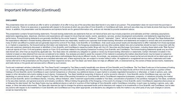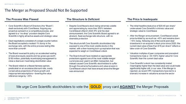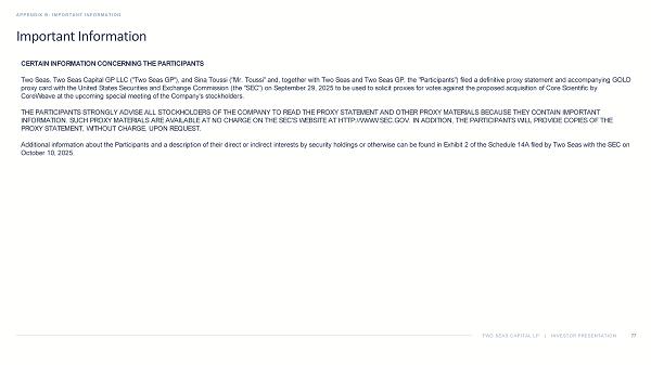 TWO SEAS CAPITAL LP | INVESTOR PRESENTATION Important Information APPENDIX B: IMPORTANT INFORMATION 77 CERTAIN INFORMATION CONCERNING THE PARTICIPANTS Two Seas, Two Seas Capital GP LLC ("Two Seas GP"), and Sina Toussi ("Mr. Toussi " and, together with Two Seas and Two Seas GP, the "Participants") filed a definitive proxy statement and accompanying GOLD proxy card with the United States Securities and Exchange Commission (the "SEC") on September 29, 2025 to be used to solicit pro xies for votes against the proposed acquisition of Core Scientific by CoreWeave at the upcoming special meeting of the Company's stockholders. THE PARTICIPANTS STRONGLY ADVISE ALL STOCKHOLDERS OF THE COMPANY TO READ THE PROXY STATEMENT AND OTHER PROXY MATERIALS BECAUS E T HEY CONTAIN IMPORTANT INFORMATION. SUCH PROXY MATERIALS ARE AVAILABLE AT NO CHARGE ON THE SEC'S WEBSITE AT HTTP://WWW.SEC.GOV. IN ADDITION, THE PAR TIC IPANTS WILL PROVIDE COPIES OF THE PROXY STATEMENT, WITHOUT CHARGE, UPON REQUEST. Additional information about the Participants and a description of their direct or indirect interests by security holdings or ot herwise can be found in Exhibit 2 of the Schedule 14A filed by Two Seas with the SEC on October 10, 2025.