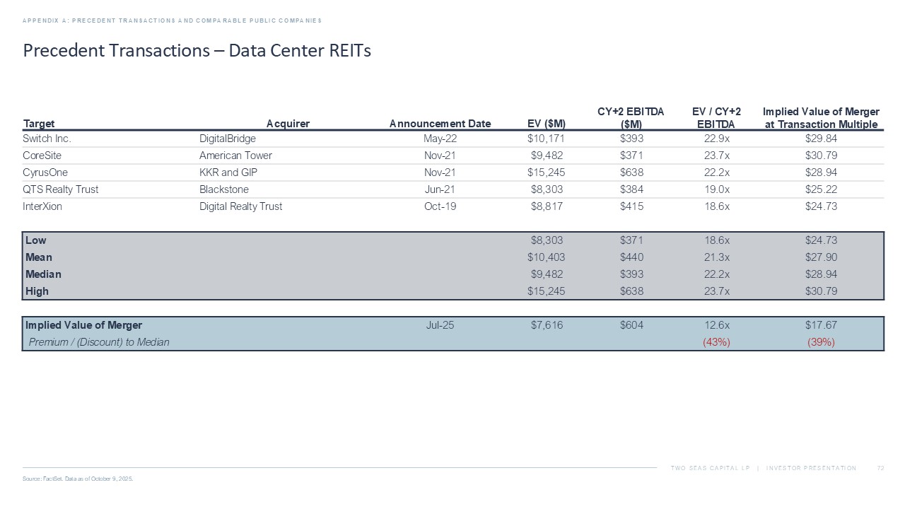 TWO SEAS CAPITAL LP | INVESTOR PRESENTATION Precedent Transactions – Data Center REITs APPENDIX A: PRECEDENT TRANSACTIONS AND COMPARABLE PUBLIC COMPANIES Source: FactSet. Data as of October 9, 2025. Implied Value of Merger at Transaction Multiple EV / CY+2 EBITDA CY+2 EBITDA ($M) EV ($M) Announcement Date Acquirer Target $29.84 22.9x $393 $10,171 May - 22 DigitalBridge Switch Inc. $30.79 23.7x $371 $9,482 Nov - 21 American Tower CoreSite $28.94 22.2x $638 $15,245 Nov - 21 KKR and GIP CyrusOne $25.22 19.0x $384 $8,303 Jun - 21 Blackstone QTS Realty Trust $24.73 18.6x $415 $8,817 Oct - 19 Digital Realty Trust InterXion $24.73 18.6x $371 $8,303 Low $27.90 21.3x $440 $10,403 Mean $28.94 22.2x $393 $9,482 Median $30.79 23.7x $638 $15,245 High $17.67 12.6x $604 $7,616 Jul - 25 Implied Value of Merger (39%) (43%) Premium / (Discount) to Median