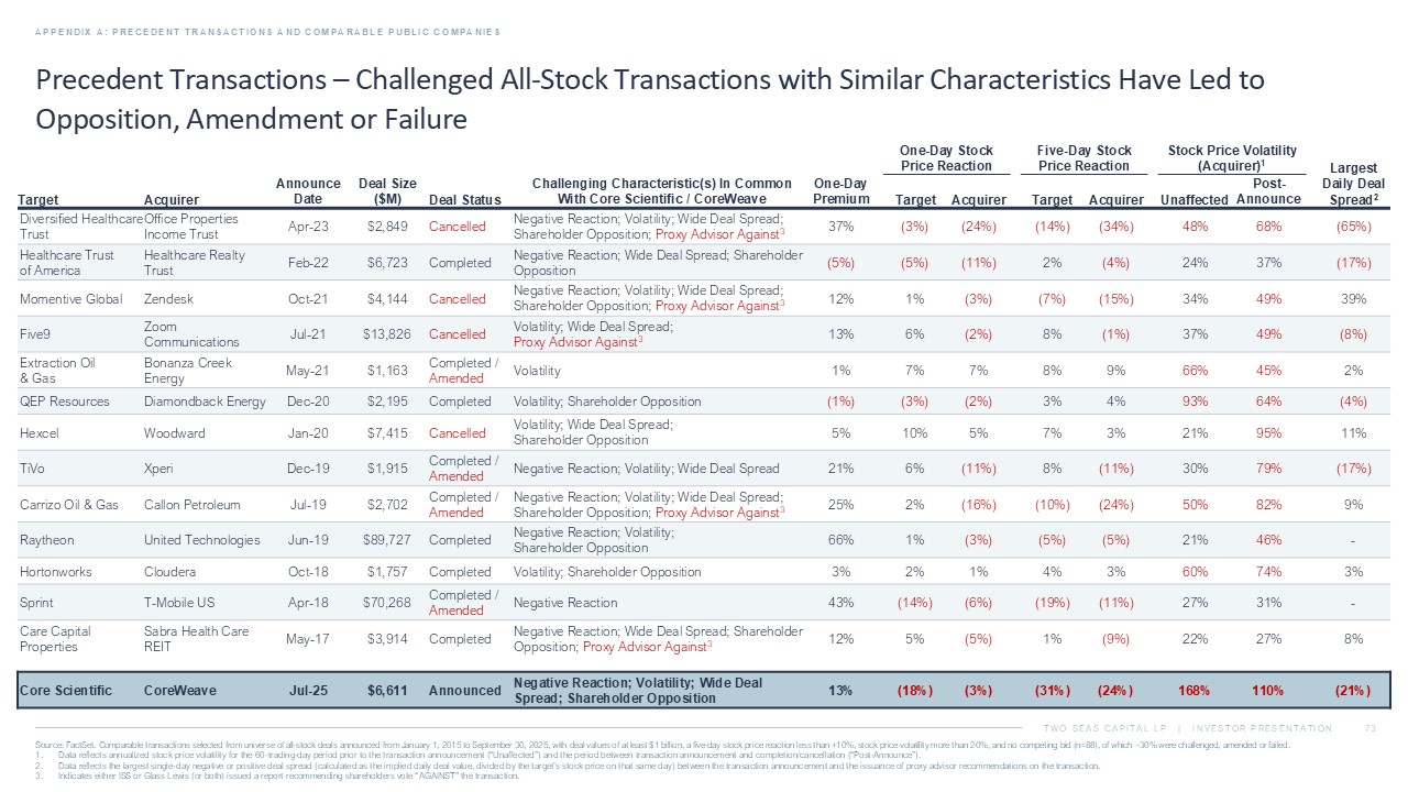 TWO SEAS CAPITAL LP | INVESTOR PRESENTATION Precedent Transactions – Challenged All - Stock Transactions with Similar Characteristics Have Led to Opposition, Amendment or Failure APPENDIX A: PRECEDENT TRANSACTIONS AND COMPARABLE PUBLIC COMPANIES Largest Daily Deal Spread 2 Stock Price Volatility (Acquirer) 1 Five - Day Stock Price Reaction One - Day Stock Price Reaction Post - Announce Unaffected Acquirer Target Acquirer Target One - Day Premium Challenging Characteristic(s) In Common With Core Scientific / CoreWeave Deal Status Deal Size ($M) Announce Date Acquirer Target (65%) 68% 48% (34%) (14%) (24%) (3%) 37% Negative Reaction; Volatility; Wide Deal Spread; Shareholder Opposition; Proxy Advisor Against 3 Cancelled $2,849 Apr - 23 Office Properties Income Trust Diversified Healthcare Trust (17%) 37% 24% (4%) 2% (11%) (5%) (5%) Negative Reaction; Wide Deal Spread; Shareholder Opposition Completed $6,723 Feb - 22 Healthcare Realty Trust Healthcare Trust of America 39% 49% 34% (15%) (7%) (3%) 1% 12% Negative Reaction; Volatility; Wide Deal Spread; Shareholder Opposition; Proxy Advisor Against 3 Cancelled $4,144 Oct - 21 Zendesk Momentive Global (8%) 49% 37% (1%) 8% (2%) 6% 13% Volatility; Wide Deal Spread; Proxy Advisor Against 3 Cancelled $13,826 Jul - 21 Zoom Communications Five9 2% 45% 66% 9% 8% 7% 7% 1% Volatility Completed / Amended $1,163 May - 21 Bonanza Creek Energy Extraction Oil & Gas (4%) 64% 93% 4% 3% (2%) (3%) (1%) Volatility; Shareholder Opposition Completed $2,195 Dec - 20 Diamondback Energy QEP Resources 11% 95% 21% 3% 7% 5% 10% 5% Volatility; Wide Deal Spread; Shareholder Opposition Cancelled $7,415 Jan - 20 Woodward Hexcel (17%) 79% 30% (11%) 8% (11%) 6% 21% Negative Reaction; Volatility; Wide Deal Spread Completed / Amended $1,915 Dec - 19 Xperi TiVo 9% 82% 50% (24%) (10%) (16%) 2% 25% Negative Reaction; Volatility; Wide Deal Spread; Shareholder Opposition; Proxy Advisor Against 3 Completed / Amended $2,702 Jul - 19 Callon Petroleum Carrizo Oil & Gas - 46% 21% (5%) (5%) (3%) 1% 66% Negative Reaction; Volatility; Shareholder Opposition Completed $89,727 Jun - 19 United Technologies Raytheon 3% 74% 60% 3% 4% 1% 2% 3% Volatility; Shareholder Opposition Completed $1,757 Oct - 18 Cloudera Hortonworks - 31% 27% (11%) (19%) (6%) (14%) 43% Negative Reaction Completed / Amended $70,268 Apr - 18 T - Mobile US Sprint 8% 27% 22% (9%) 1% (5%) 5% 12% Negative Reaction; Wide Deal Spread; Shareholder Opposition; Proxy Advisor Against 3 Completed $3,914 May - 17 Sabra Health Care REIT Care Capital Properties (21%) 110% 168% (24%) (31%) (3%) (18%) 13% Negative Reaction; Volatility; Wide Deal Spread; Shareholder Opposition Announced $6,611 Jul - 25 CoreWeave Core Scientific Source: FactSet. Comparable transactions selected from universe of all - stock deals announced from January 1, 2015 to September 3 0, 2025, with deal values of at least $1 billion, a five - day stock price reaction less than +10%, stock price volatility more th an 20%, and no competing bid (n=88), of which ~30% were challenged, amended or failed. 1. Data reflects annualized stock price volatility for the 60 - trading - day period prior to the transaction announcement (“Unaffected ”) and the period between transaction announcement and completion/cancellation (“Post - Announce”). 2. Data reflects the largest single - day negative or positive deal spread (calculated as the implied daily deal value, divided by th e target’s stock price on that same day) between the transaction announcement and the issuance of proxy advisor recommendatio ns on the transaction. 3. Indicates either ISS or Glass Lewis (or both) issued a report recommending shareholders vote “AGAINST” the transaction.