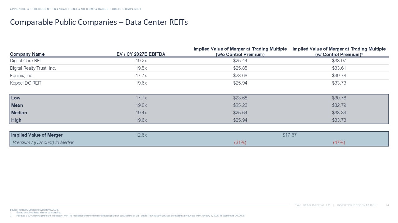 TWO SEAS CAPITAL LP | INVESTOR PRESENTATION Comparable Public Companies – Data Center REITs APPENDIX A: PRECEDENT TRANSACTIONS AND COMPARABLE PUBLIC COMPANIES Source: FactSet. Data as of October 9, 2025. 1. Based on fully diluted shares outstanding. 2. Reflects a 30% control premium, consistent with the median premium to the unaffected price for acquisitions of U.S. public Te chn ology Services companies announced from January 1, 2020 to September 30, 2025. Implied Value of Merger at Trading Multiple (w/ Control Premium) 2 Implied Value of Merger at Trading Multiple (w/o Control Premium) EV / CY 2027E EBITDA CY 2027E EBITDA ($M) EV ($M) 1 Company Name $33.07 $25.44 19.2x $84 $1,604 Digital Core REIT $33.50 $25.77 19.5x $4,067 $79,176 Digital Realty Trust, Inc. $30.72 $23.63 17.7x $5,460 $96,398 Equinix, Inc. $33.71 $25.93 19.6x $268 $5,255 Keppel DC REIT $30.72 $23.63 17.7x $84 $1,604 Low $32.75 $25.19 19.0x $2,470 $45,608 Mean $33.29 $25.60 19.3x $2,168 $42,216 Median $33.71 $25.93 19.6x $5,460 $96,398 High $17.67 12.6x $604 $7,616 Implied Value of Merger (47%) (31%) Premium / (Discount) to Median