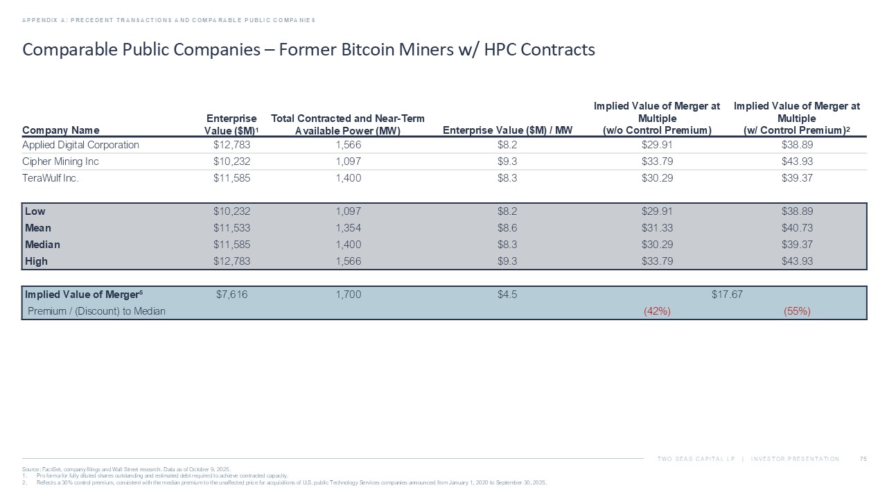 TWO SEAS CAPITAL LP | INVESTOR PRESENTATION Comparable Public Companies – Former Bitcoin Miners w/ HPC Contracts APPENDIX A: PRECEDENT TRANSACTIONS AND COMPARABLE PUBLIC COMPANIES Source: FactSet, company filings and Wall Street research. Data as of October 9, 2025. 1. Pro forma for fully diluted shares outstanding and estimated debt required to achieve contracted capacity. 2. Reflects a 30% control premium, consistent with the median premium to the unaffected price for acquisitions of U.S. public Te chn ology Services companies announced from January 1, 2020 to September 30, 2025. Implied Value of Merger at Multiple (w/ Control Premium) 2 Implied Value of Merger at Multiple (w/o Control Premium) Enterprise Value ($M) / MW Total Contracted and Near - Term Available Power (MW) Enterprise Value ($M) 1 Company Name $38.89 $29.91 $8.2 1,566 $12,783 Applied Digital Corporation $43.93 $33.79 $9.3 1,097 $10,232 Cipher Mining Inc $39.37 $30.29 $8.3 1,400 $11,585 TeraWulf Inc. $38.89 $29.91 $8.2 1,097 $10,232 Low $40.73 $31.33 $8.6 1,354 $11,533 Mean $39.37 $30.29 $8.3 1,400 $11,585 Median $43.93 $33.79 $9.3 1,566 $12,783 High $17.67 $4.5 1,700 $7,616 Implied Value of Merger⁵ (55%) (42%) Premium / (Discount) to Median