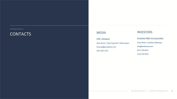 79 CONTACTS TWO SEAS CAPITAL LP TWO SEAS CAPITAL LP | INVESTOR PRESENTATION ASC Advisors Steve Bruce / Taylor Ingraham / Keely Gispan twoseas@ascadvisors.com (203) 992 - 1230 MEDIA Innisfree M&A Incorporated Scott Winter / Jonathan Salzberger info@innisfreema.com (877) 750 - 0831 (212) 750 - 5833 INVESTORS