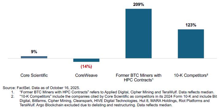 The unprecedented investment in the AI infrastructure build-out has led to a surge in the equity values of HPC data center companies. The stock prices of each of Core Scientific’s three closest peers, Applied Digital, Cipher Mining and TeraWulf – each a former Bitcoin miner with HPC contracts – have approximately tripled since the announcement of the Company’s proposed sale to CoreWeave, and nearly quadrupled since rumors of the proposed sale first emerged in June 2025.2