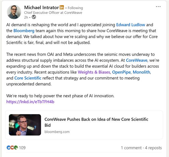 The following communication was posted by Michael Intrator, Chief Executive Officer of CoreWeave, Inc., on his LinkedIn account on October 7, 2025 in connection with CoreWeave’s proposed acquisition of Core Scientific, Inc. and other acquisition activities.