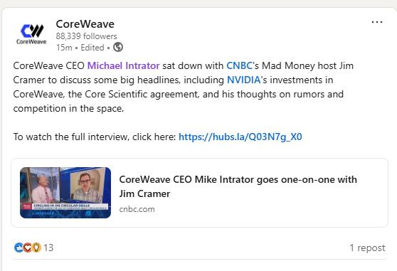 The following communication was posted by CoreWeave, Inc. on its LinkedIn account on October 10, 2025 in relation to an interview with Michael Intrator, Chief Executive Officer of CoreWeave, on October 8, 2025 in connection with CoreWeave’s proposed acquisition of Core Scientific, Inc. and other acquisition activities.